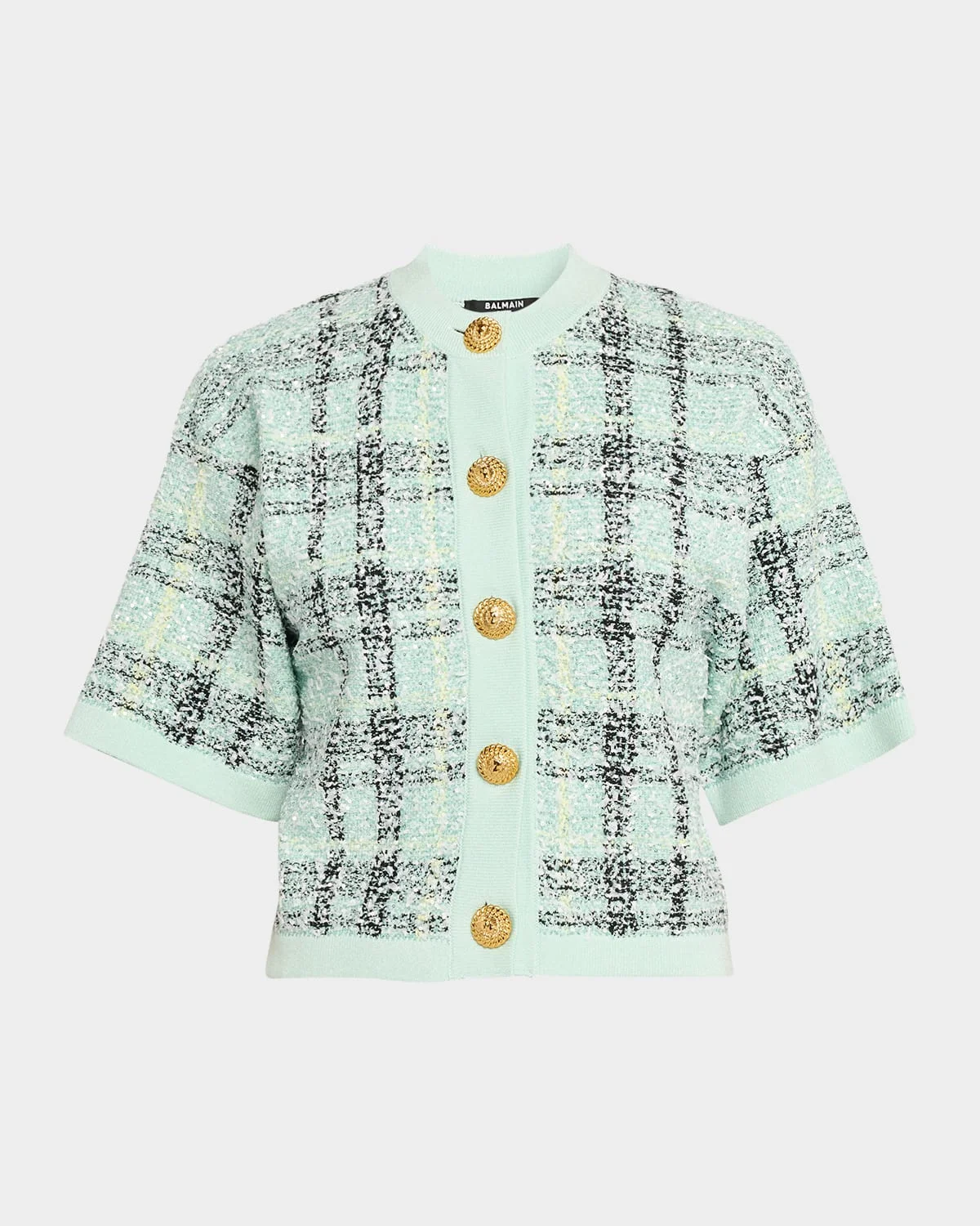 Balmain cardigan is crafted from a paillette check tweed with contrast ribbed knit trim and signature goldtone buttons Round neckline; single-breasted front Short sleeves Relaxed fit Hip length Viscose/nylon/polyamide/polyester Professional cleaning recommended Made in Italy
