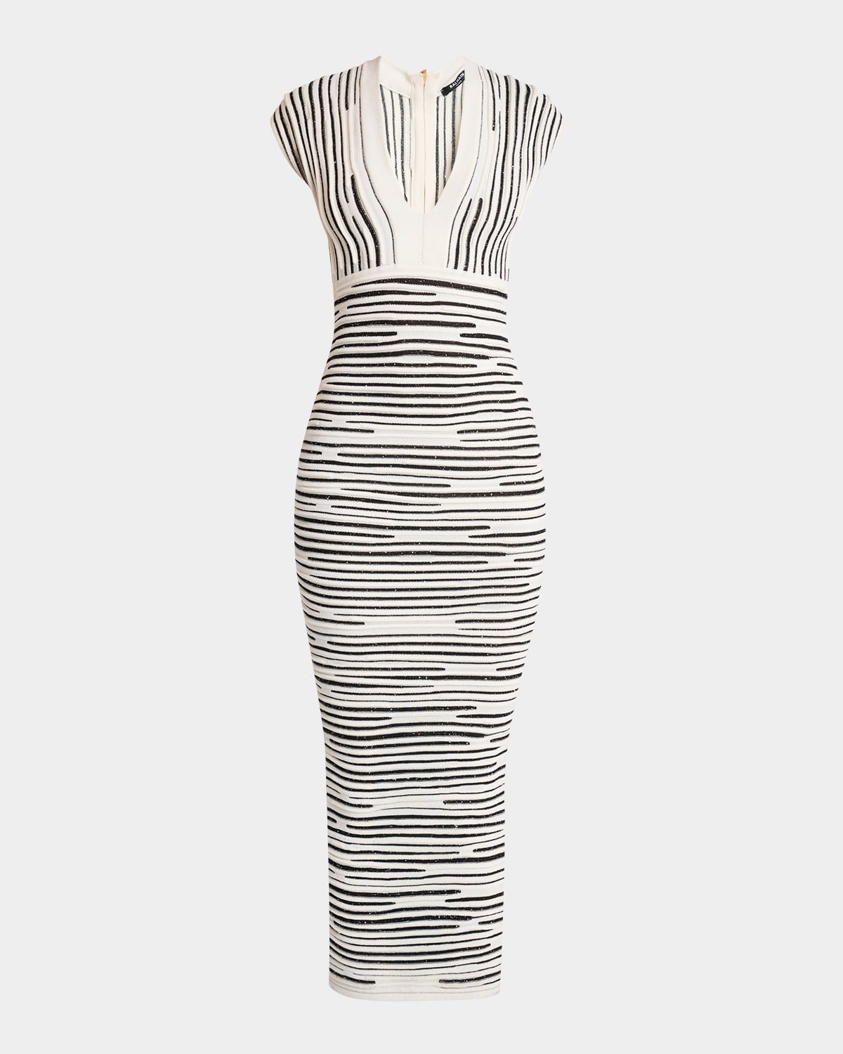 - With just a hint of glitter, this Balmain figure-sculpting dress is handcrafted from a subtly shimmering stretch-knit, giving a bold yet refined choice for cocktail hour and artful evening elegance - Plunging neckline - Cap sleeves - Body-skimming silhouette - Hem falls below the knee - Two-way back zip closure - Nylon/polyamide - Professional cleaning recommended - Made in France