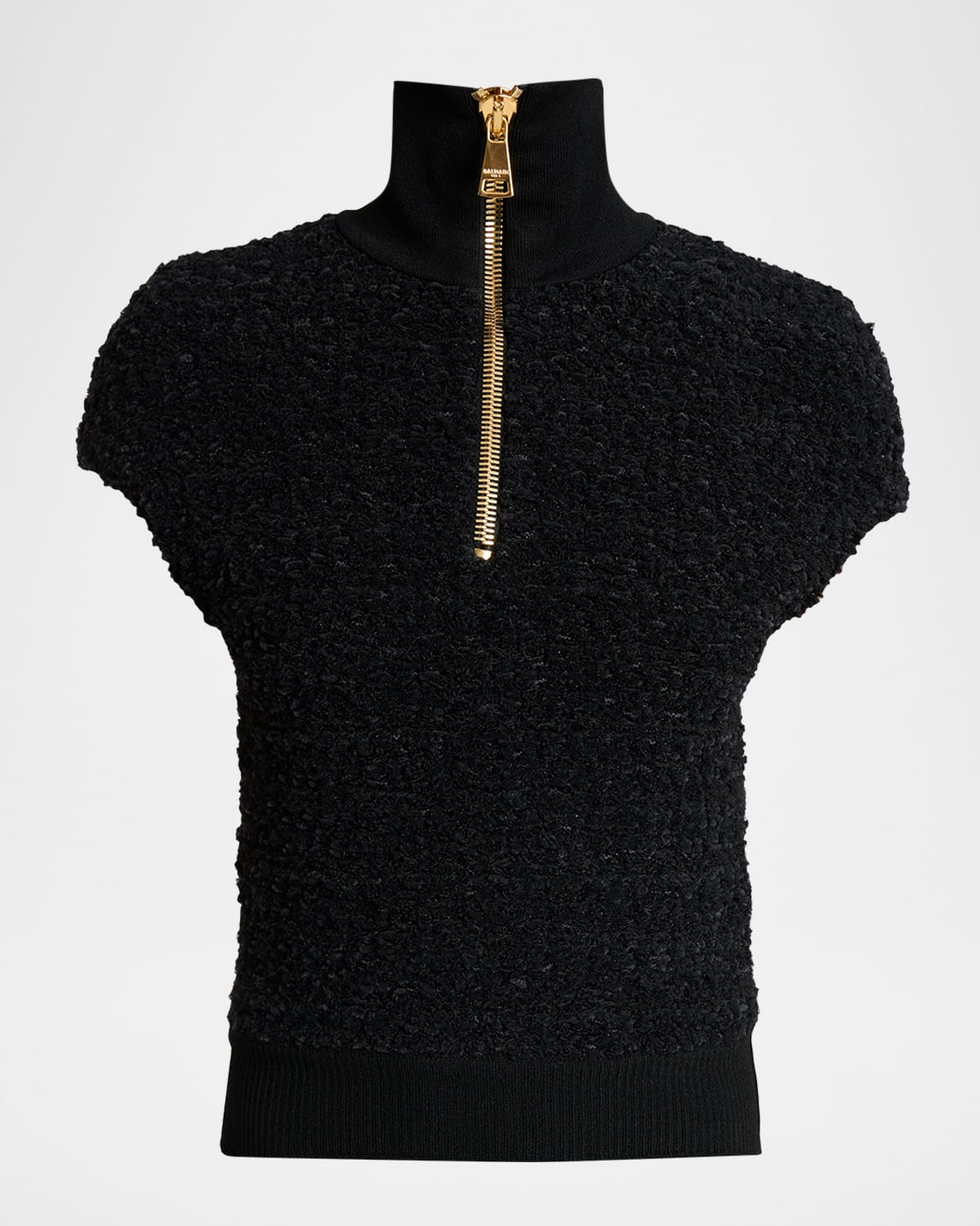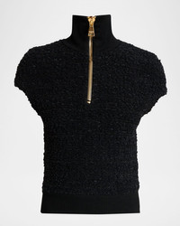 - Balmain sweater tee in a textured wool blend - Stand collar; half zip-front - Short sleeves - Classic fit - Ribbed hem - Pullover style - Merino wool/cotton/nylon/polyamide - Professional cleaning recommended - Made in France