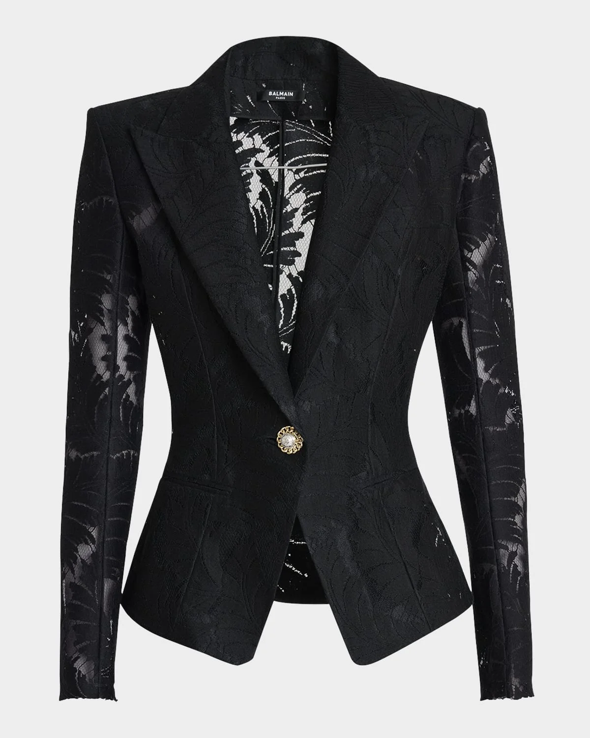 - Balmain lace jacket with a two-tone signature button - Peak lapels; single-breasted front - Long sleeves - Padded shoulders - Hip welt pockets - Fitted - Hip length - Nylon/polyamide - Made in France