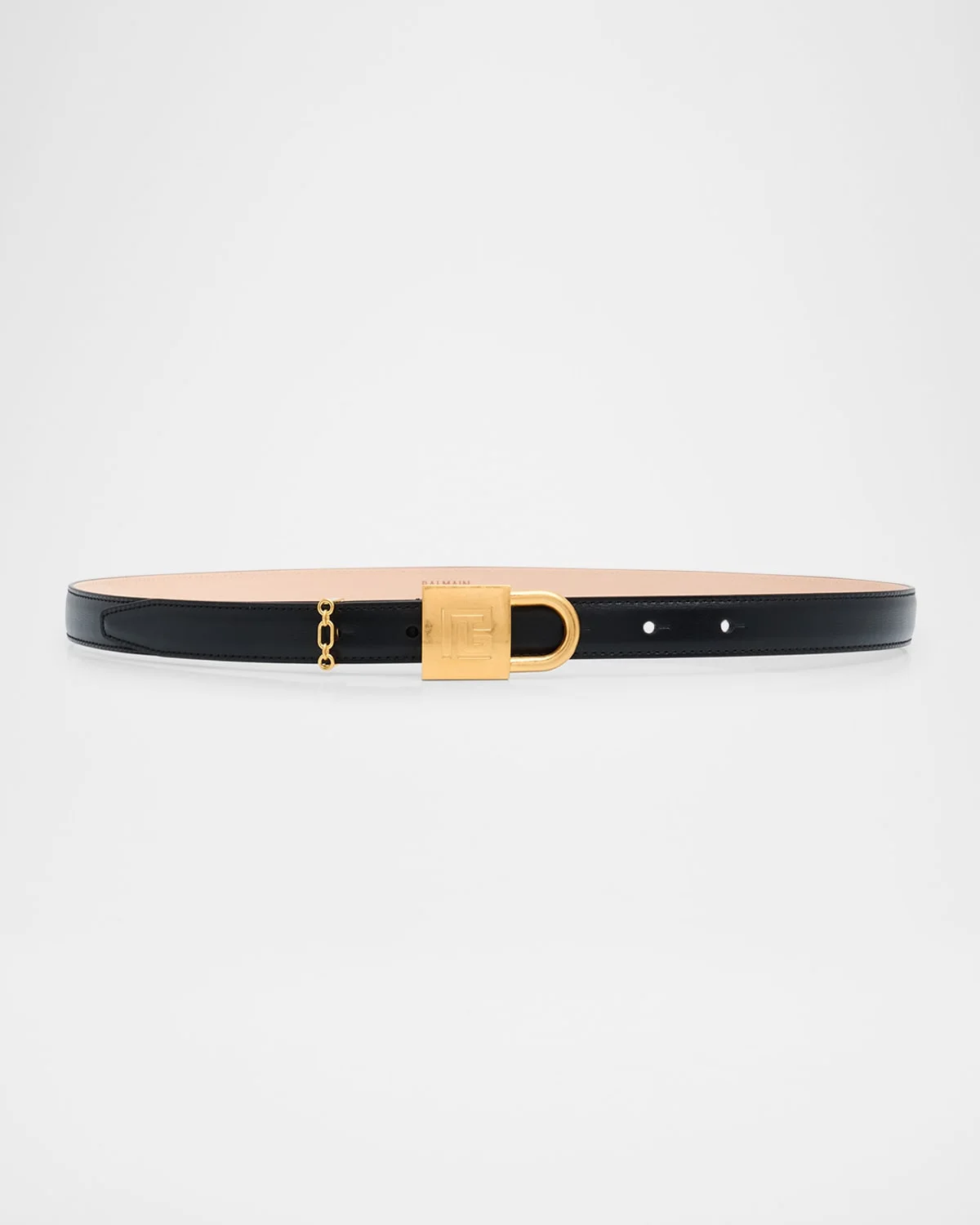 - Balmain "Sync" calfskin leather belt featuring a PB-engraved golden metal lock buckle - Approx. 0.78"W - Adjustable fit - Metal chain loop - Buckle closure - Made in Italy