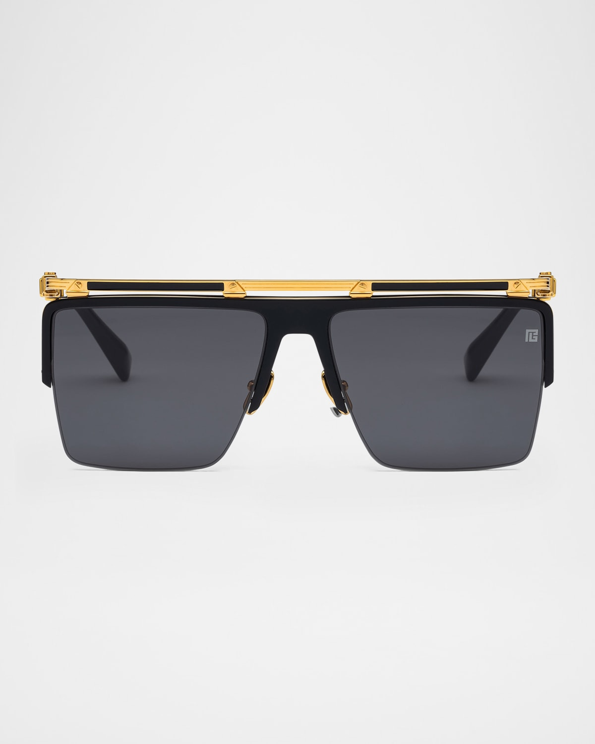 - Balmain "Triomphe" rectangle sunglasses in titanium and acetate - Eye/bridge/temple (in mm): 61-17-145 - Brow bar - Solid lenses - Saddle nose bridge - Thin, tapered arms - B monogram accents on lenses - Logo on earpieces - Titanium/acetate - 100% UVA/UVB protection - Made in Japan - Proposition 65 warning for California residents