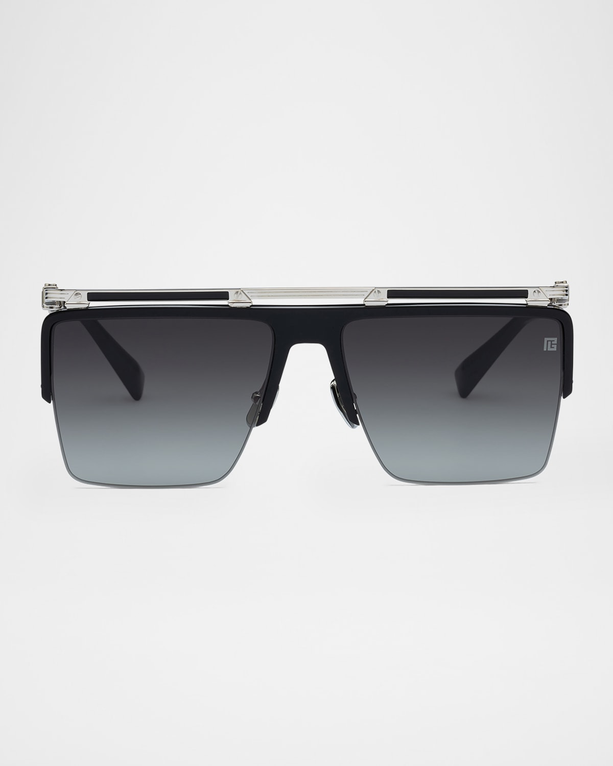 - Balmain "Triomphe" rectangle sunglasses in titanium and acetate - Eye/bridge/temple (in mm): 61-17-145 - Brow bar - Solid lenses - Saddle nose bridge - Thin, tapered arms - B monogram accents on lenses - Logo on earpieces - Titanium/acetate - 100% UVA/UVB protection - Made in Japan - Proposition 65 warning for California residents