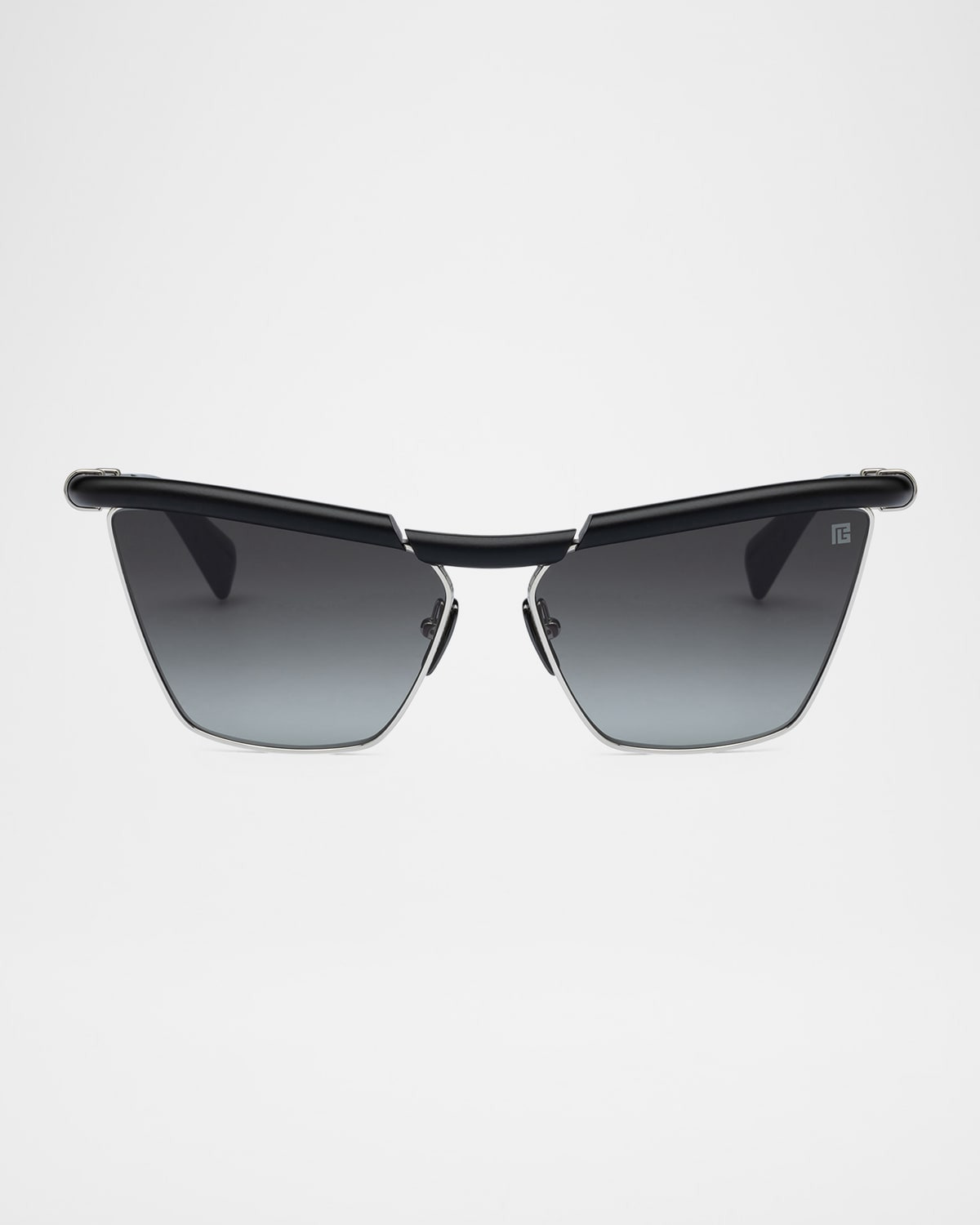 - Balmain "Victorie" cat-eye sunglasses in titanium - Eye/bridge/temple (in mm): 60-14-143 - Solid lenses - Saddle nose bridge - Thin, tapered arms - Monogram at lens - Titanium - 100% UVA/UVB protection - Made in Japan - Proposition 65 warning for California residents