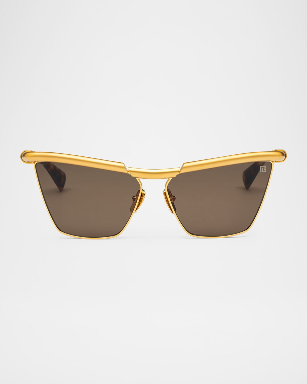 - Balmain "Victorie" cat-eye sunglasses in titanium - Eye/bridge/temple (in mm): 60-14-143 - Solid lenses - Saddle nose bridge - Thin, tapered arms - Monogram at lens - Titanium - 100% UVA/UVB protection - Made in Japan - Proposition 65 warning for California residents