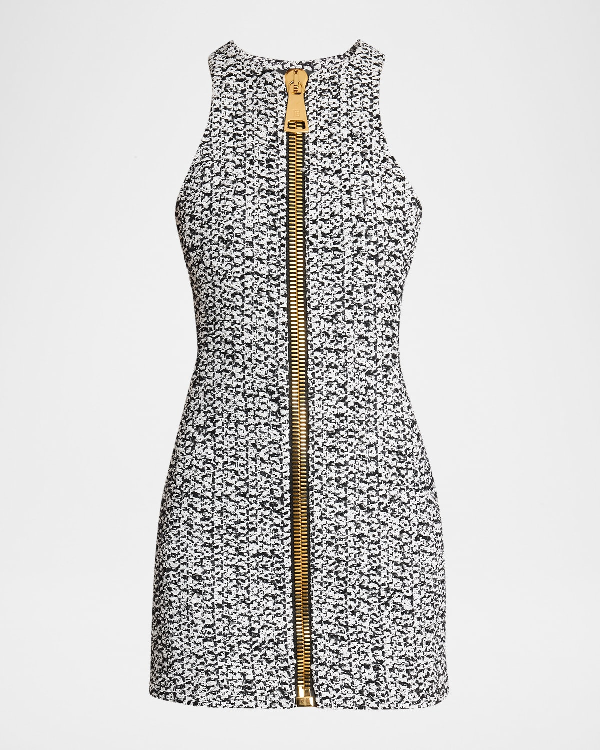 - Crafted in two-tone tweed, this Balmain mini dress is finished with chunky gold-tone hardware for a signature touch. - High neckline - Sleeveless - Figure-hugging silhouette - Hem falls above the knee - Zip-front - Viscose/cotton - Professional cleaning recommended - Imported