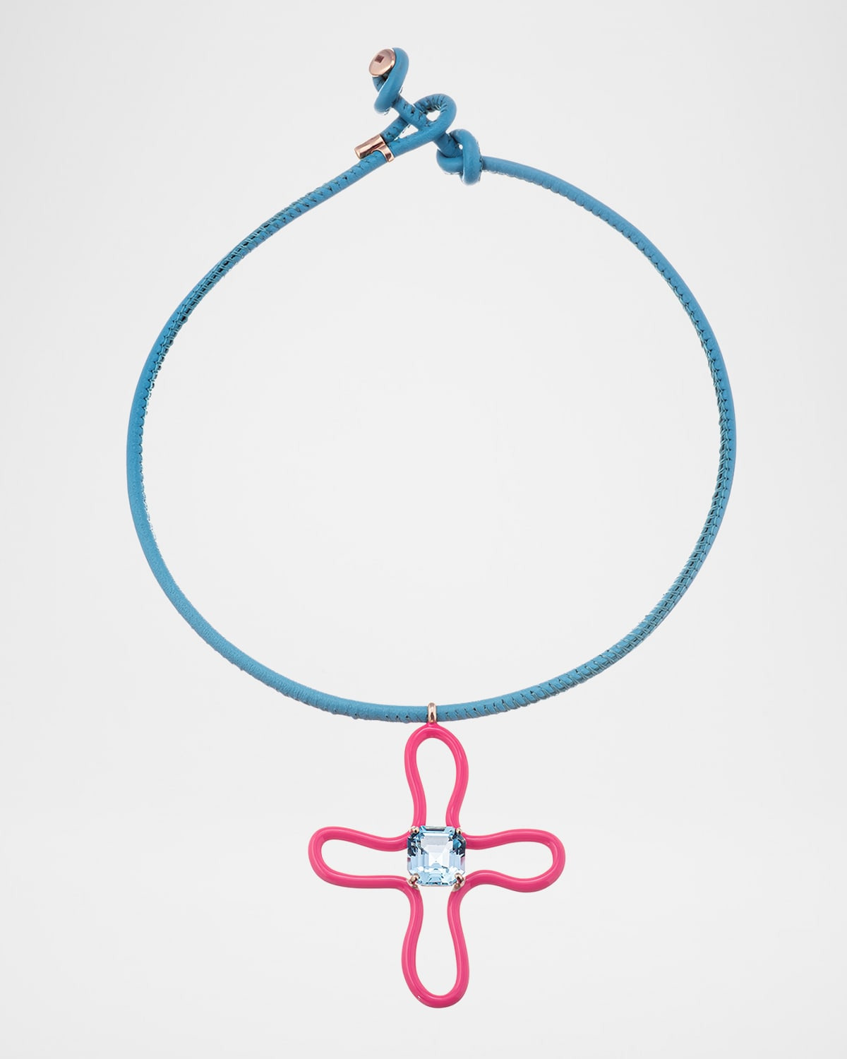 - Bea Bongiasca choker necklace - Necklace length: approx. 16-18 inches (Adjustable) - Sterling silver hand-painted with pink enamel - Polished 9-karat yellow gold - Blue calf leather cord - Octagon-cut blue topaz - Topaz total carat weight: 5.38 - Toggle fastening - Wipe clean - Made in Italy
