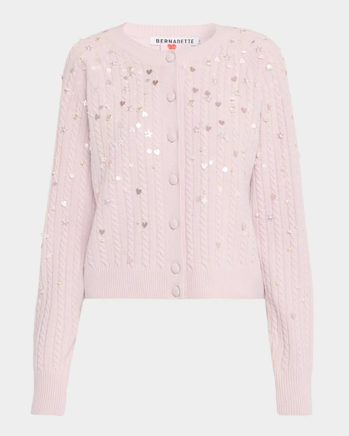 Crafted from woolcashmere cable knit, the "Gilbert" cardigan from BERNADETTE features degrade sequin and bead embellishment Crew neckline; button front Long raglan sleeves Relaxed fit Ribbed cuffs and hem Wool/cashmere Made in Romania
