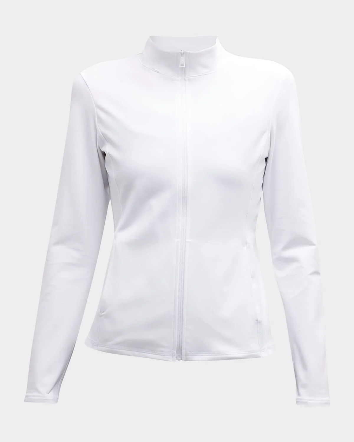 Beyond Yoga "On The Go" jacket in spacedye performance fabric. Moisturewicking, UV protection, and 4way stretch. Mock neckline. Long sleeves. Fullzip front. Inseam pockets. Relaxed fit. Polyester/Lycra® Xfit spandex. Imported.