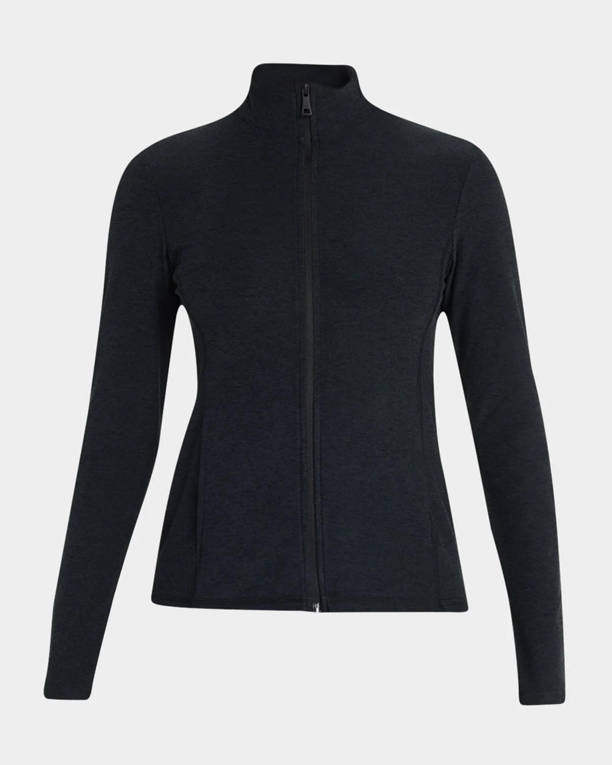 Beyond Yoga "On The Go" jacket in spacedye performance fabric. Moisturewicking, UV protection, and 4way stretch. Mock neckline. Long sleeves. Fullzip front. Inseam pockets. Relaxed fit. Polyester/Lycra® Xfit spandex. Imported.