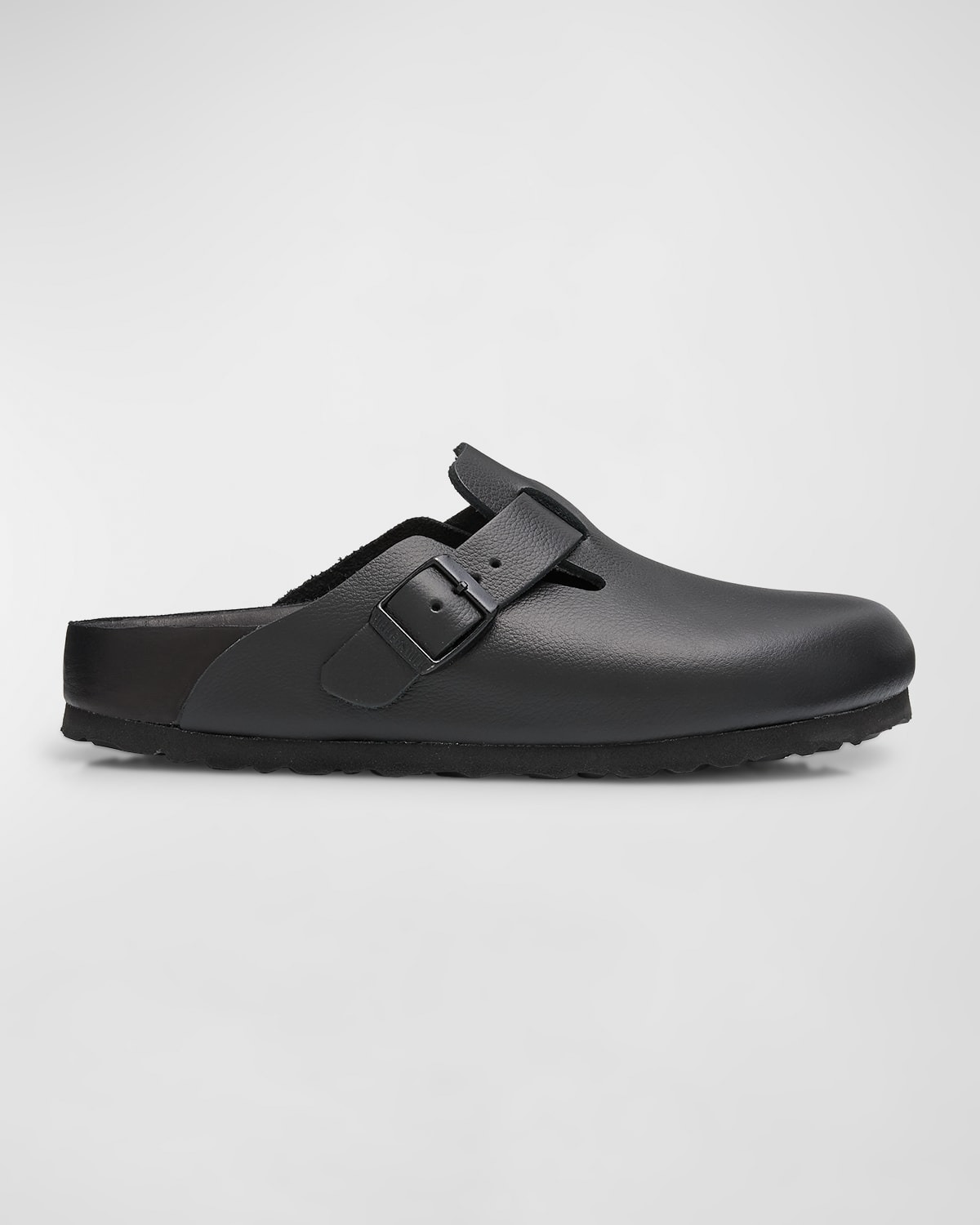 - BIRKENSTOCK "Boston" leather comfort clogs. - 0.4" flat heel. - Round toe. - Buckle strap at vamp. - Slide style. - Molded footbed. - Lightweight, flexible EVA outsole. - Made in Germany.