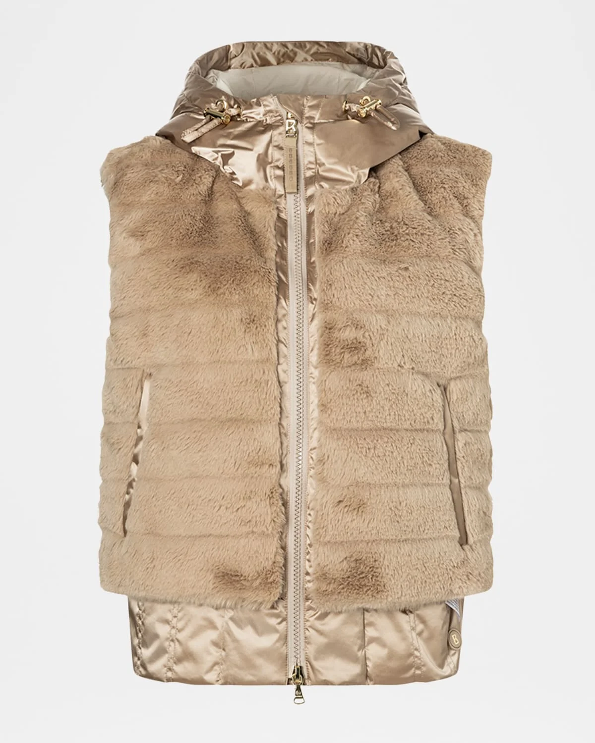 From the Bogner Sport collection, the "Yumi" down vest is crafted in plush faux fur (polyester) with satin trim that accents an adjustable hood for a personalized fit. Breathable and waterrepellent Hooded neckline; twoway zipfront with logo pulls Sleeveless Side zip pockets; one interior pocket Loose fit Adjustable drawcord hem Nylon/polyamide Fill: Down/feather Lining: Polyester/recycled polyester Trim: Metal, faux fur Machine wash cold Imported
