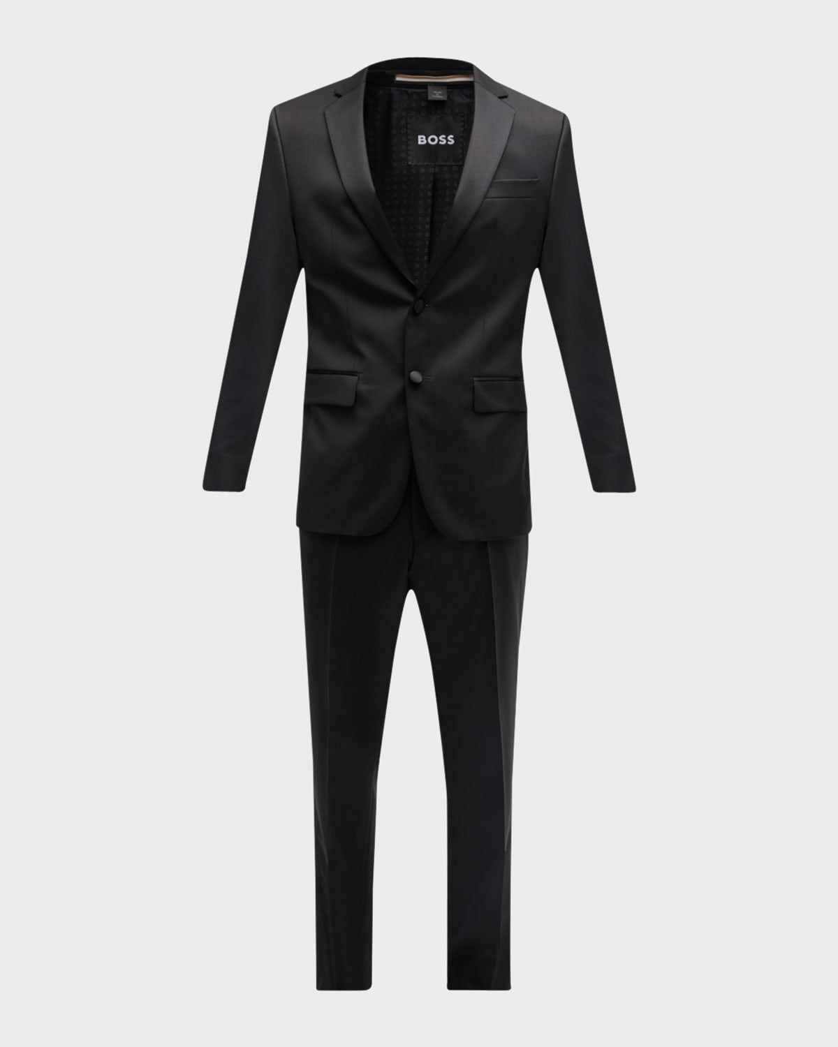 - BOSS Hugo Boss "Halven Gentry" two-piece tuxedo suit. - Approx. length: - 29"L down center back. - Satin peak lapel; one-button front. - Four-button detail at cuffs. - Front flap pockets; chest welt pocket. - Double-vented back. - Slim fit. - Flat-front trousers. - Satin trim down sides. - Unfinished hem to be tailored to desired length. - Wool. - Dry clean. - Made in Italy. - Size Note: Model height: 6'1"/185cm - Item runs small, consider ordering a size up.