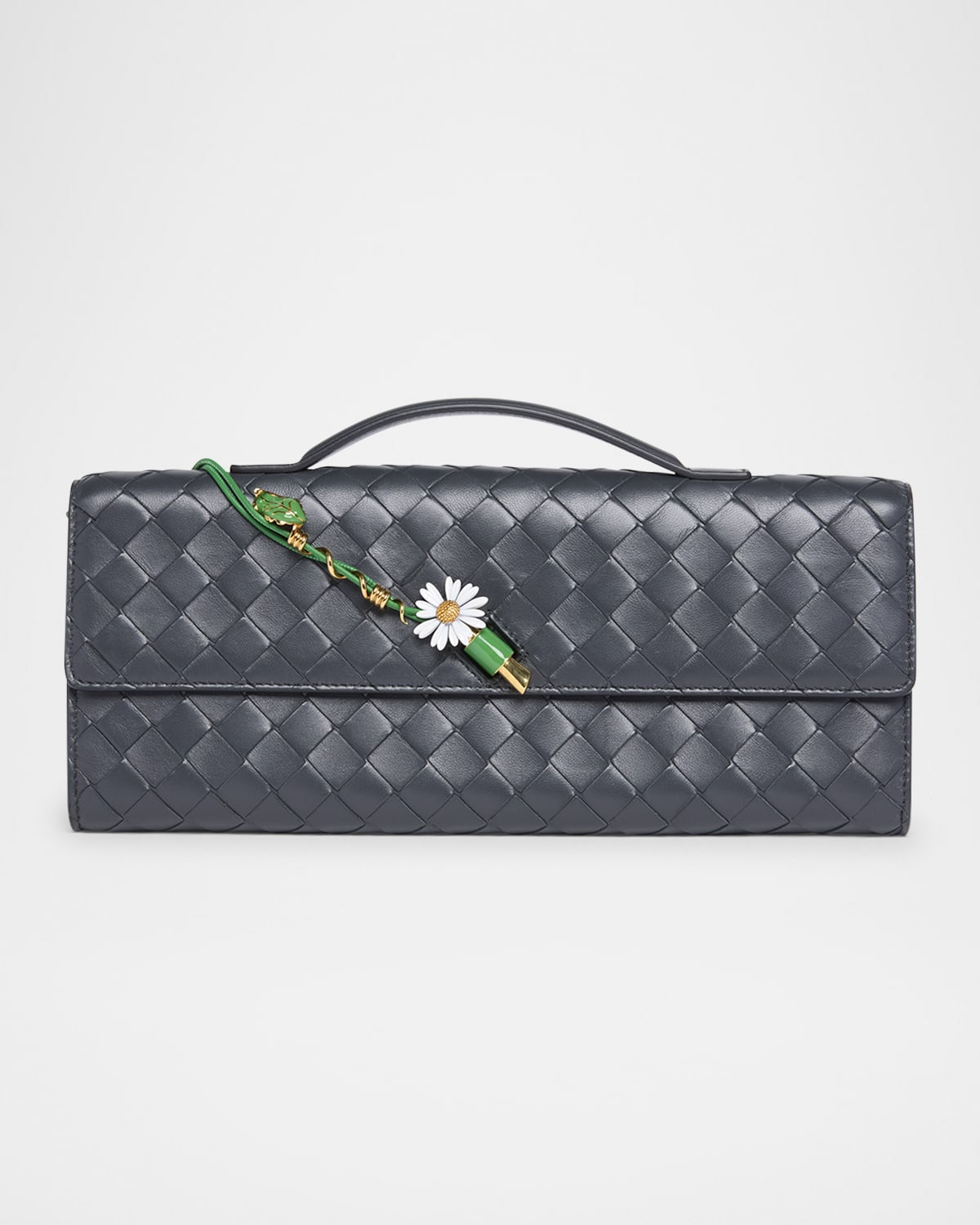- Bottega Veneta "Andiamo" clutch bag in - intrecciato - nappa leather with enameled flower embellishment - Top handle - Can be worn as a top handle or clutch bag - Flap top with metal knot accent - Interior, six card slots and one slip pocket - Approx. 5.1"H x 12.2"W x 1.2"D - Made in Italy