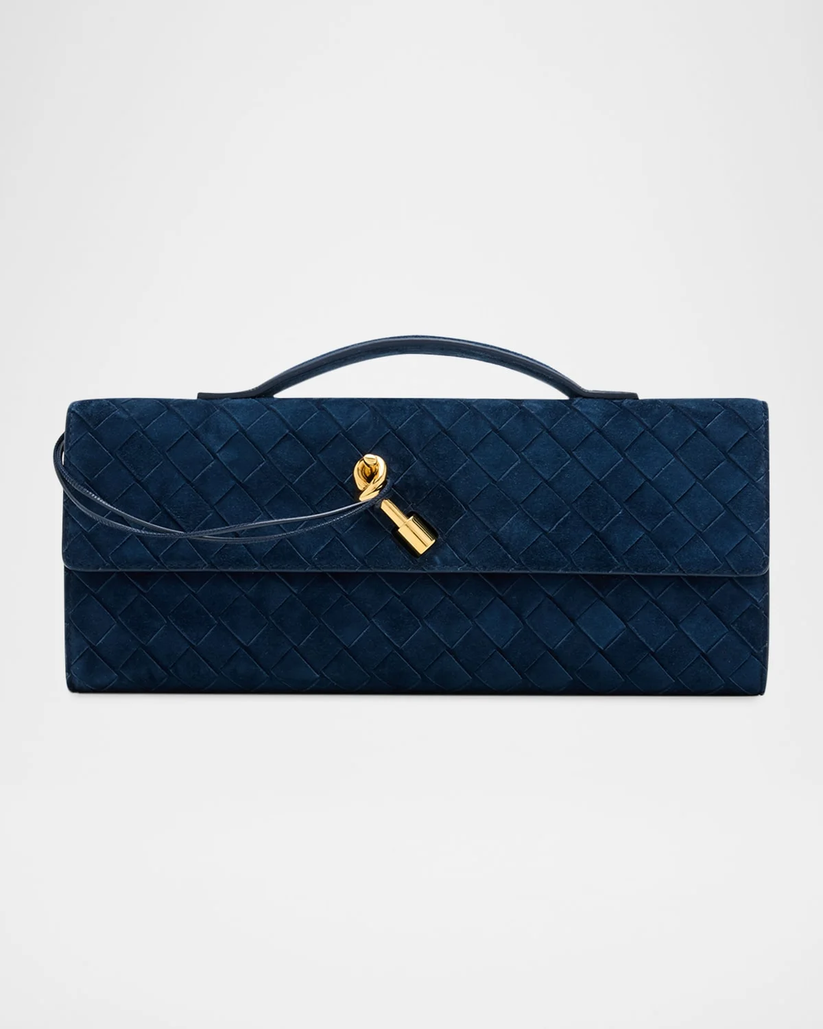 This Bottega Veneta "Andiamo" clutch bag is crafted in intrecciato suede with a signature knot accent Flat top handle, 0.8" drop Flap top with a knot prong clasp Interior, one slip pocket, six card slots Lambskin leather lining Approx. 5.1"H x 12.2"W x 1.2"D Made in Italy