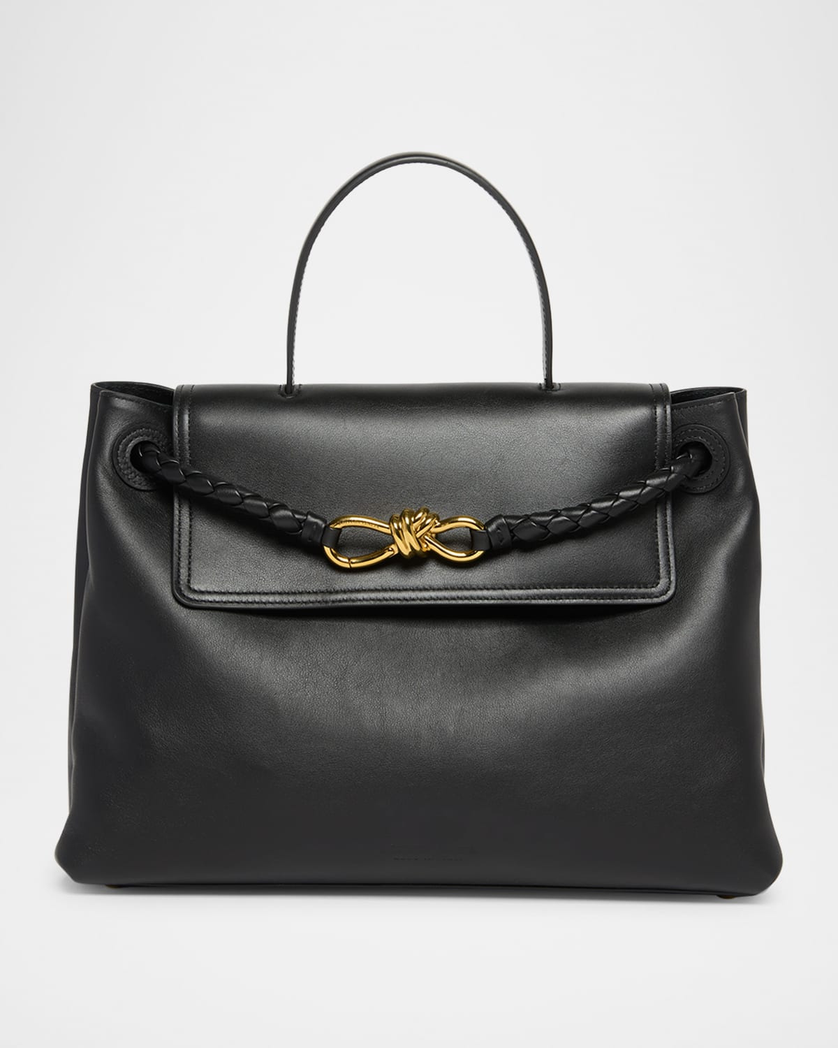 - Bottega Veneta "Andiamo" smooth leather top handle bag with signature sliding knot accent - Top handle - Removable shoulder strap - Can be worn as a top handle or shoulder bag - Fold-over flap top with hook closure - Divided compartment interior; intrecciato trim - Feet protect bottom of bag - Approx. 10.2"H x 13"W x 5.9"D - Made in Italy