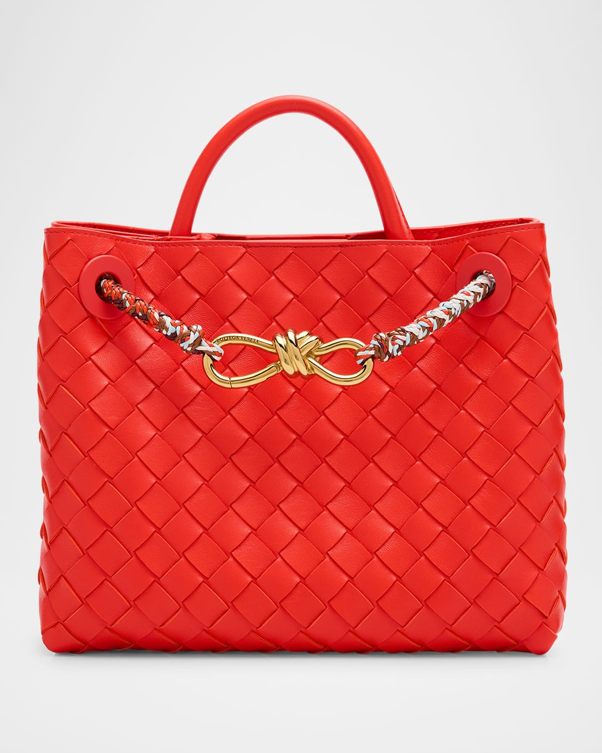 - This iconic "Andiamo" top-handle bag from Bottega Veneta is crafted in - intrecciato - leather and elevated by the braided strap and signature knot detail - Softly structured silhouette with rounded sides - Rolled top handle, 2.4" drop - Sliding braided leather shoulder strap, 19.7" drop - Can be worn as a top handle or shoulder bag - Open top with magnetic closure - Interior, one zip pocket and one slip pocket - Approx. 7.9"H x 9.8"W x 3.9"D - Made in Italy