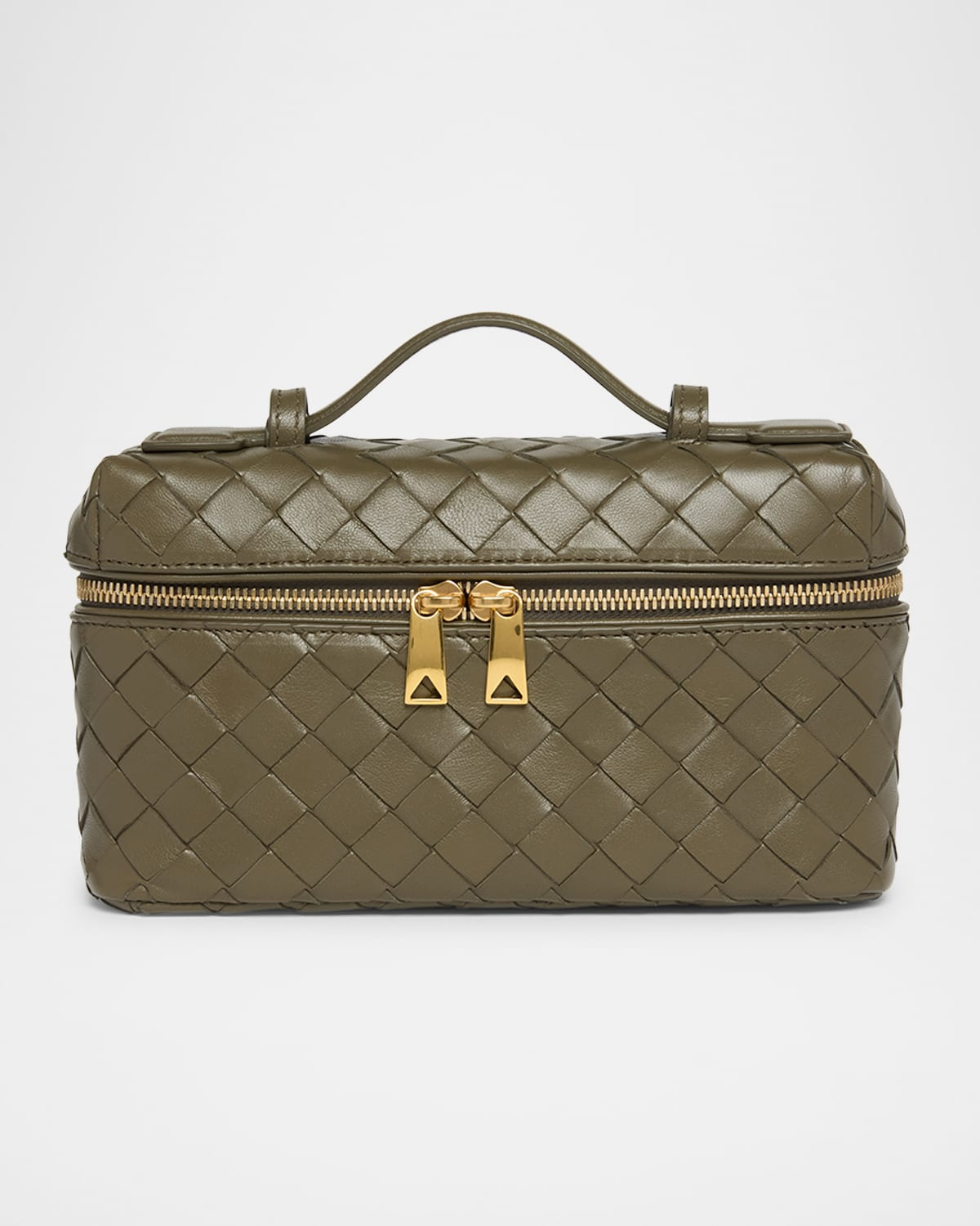- Bottega Veneta "Bang Bang" vanity case in - intrecciato - leather - Top handle - Removable, adjustable crossbody strap - Can be worn as a top handle or crossbody bag - Two-way zip top closure - Interior, one slip pocket - Approx. 5"H x 9"W x 2"D - Made in Italy