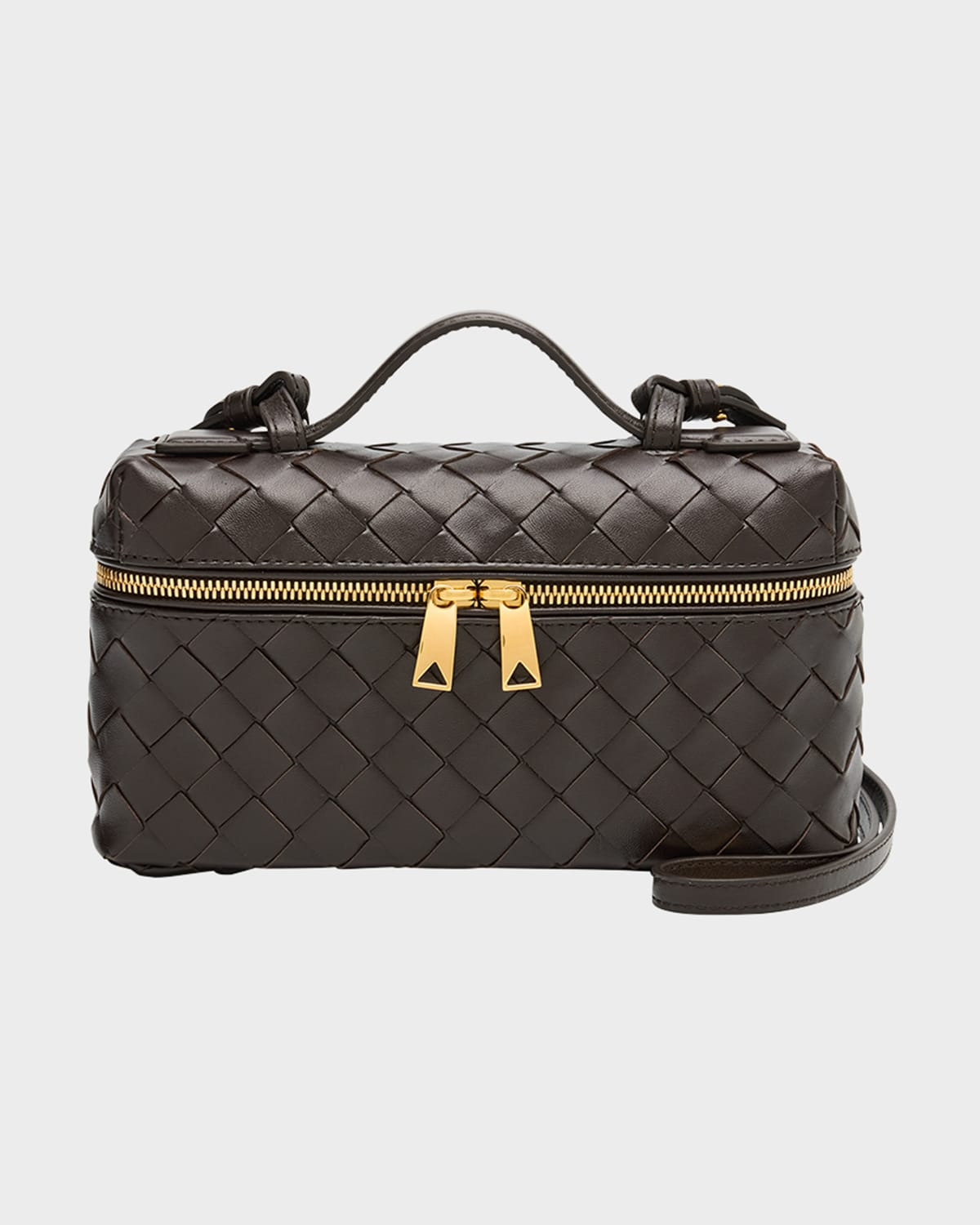 - Bottega Veneta "Bang Bang" vanity case in - intrecciato - leather - Top handle - Removable, adjustable crossbody strap - Can be worn as a top handle or crossbody bag - Two-way zip top closure - Interior, one slip pocket - Approx. 5"H x 9"W x 2"D - Made in Italy