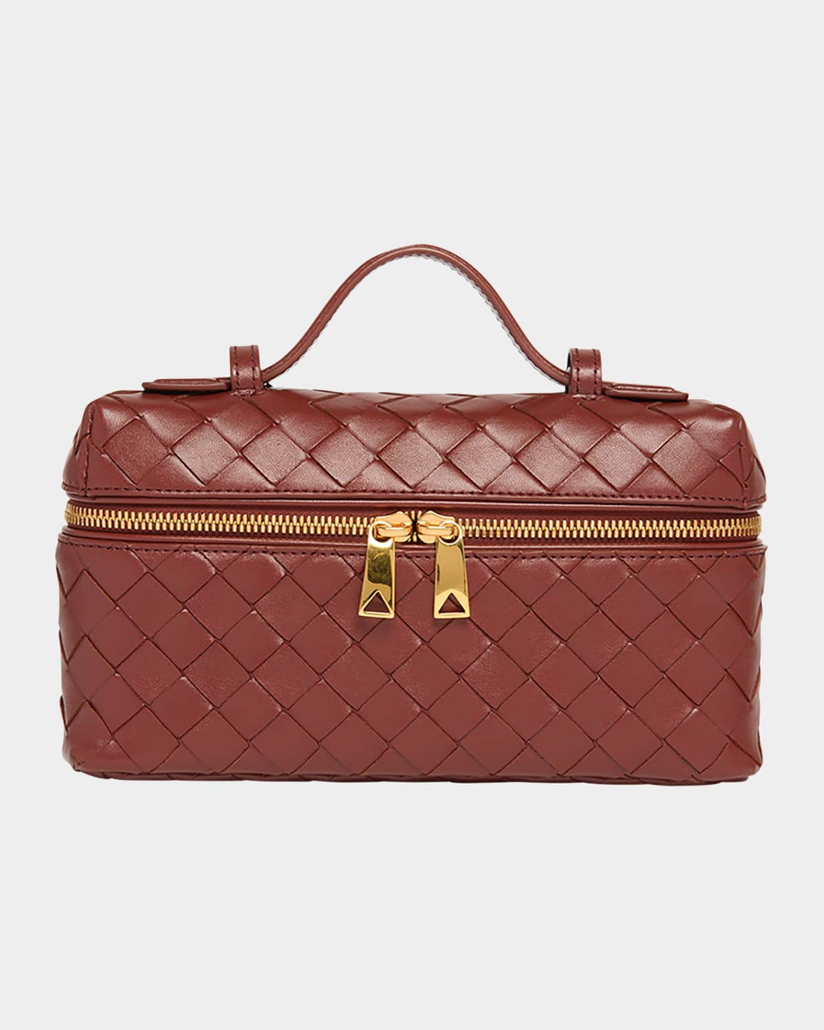 - Bottega Veneta "Bang Bang" vanity case in - intrecciato - leather - Top handle - Removable, adjustable crossbody strap - Can be worn as a top handle or crossbody bag - Two-way zip top closure - Interior, one slip pocket - Approx. 5"H x 9"W x 2"D - Made in Italy