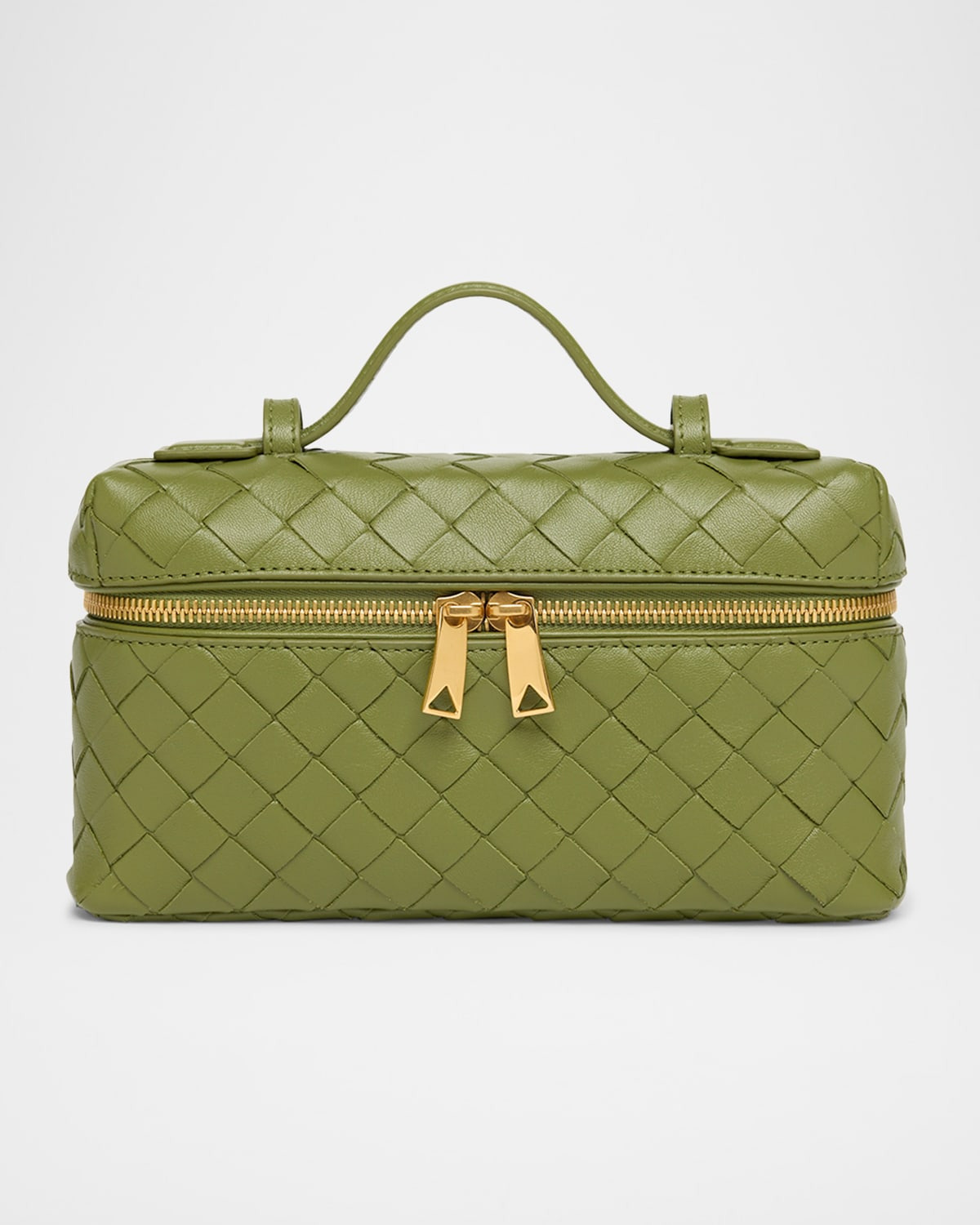 - Bottega Veneta "Bang Bang" vanity case in - intrecciato - leather - Top handle - Removable, adjustable crossbody strap - Can be worn as a top handle or crossbody bag - Two-way zip top closure - Interior, one slip pocket - Approx. 5"H x 9"W x 2"D - Made in Italy