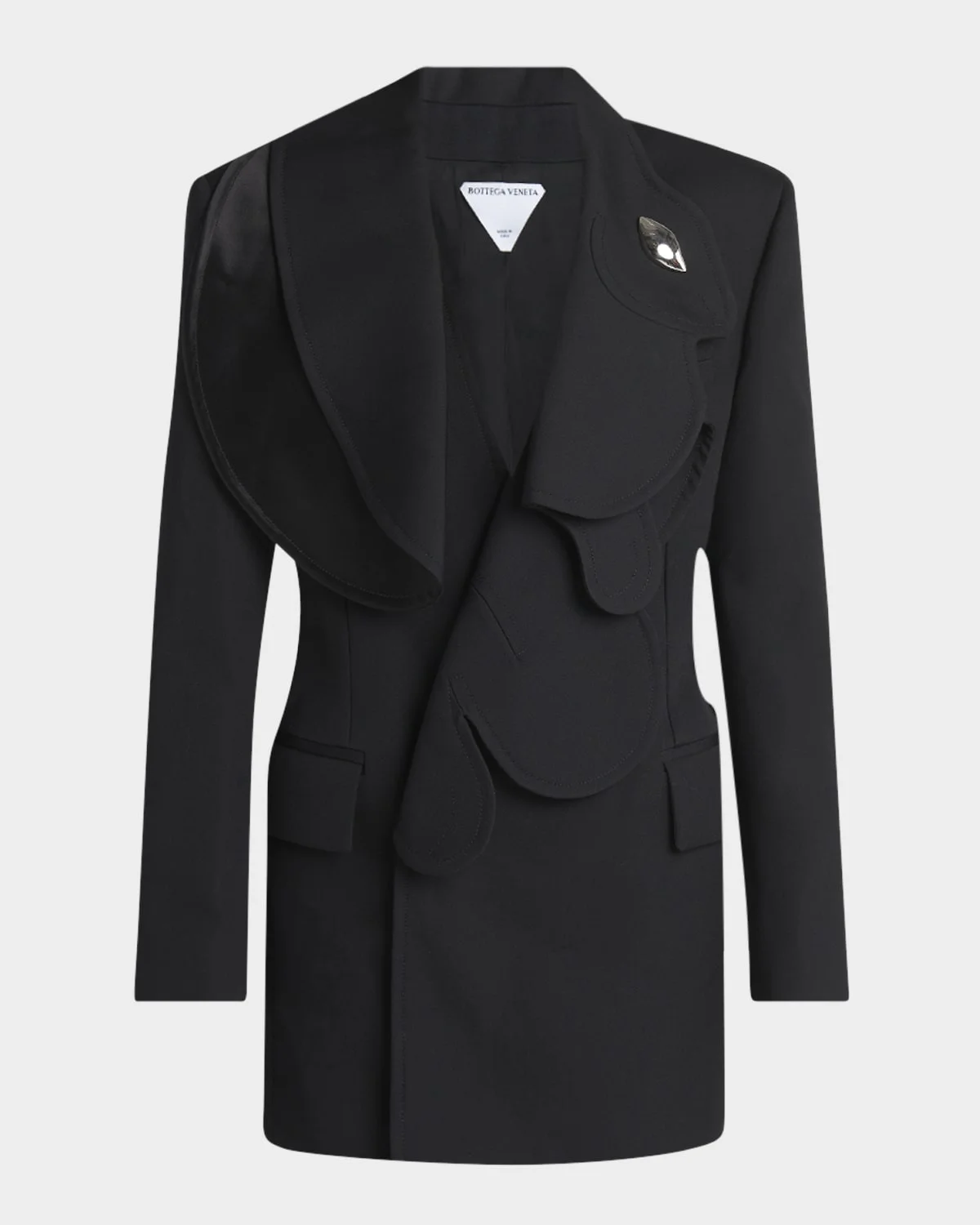 - Bottega Veneta compact wool jacket featuring lapels in the shape of a bunny with a silvertone brooch - Shawl lapels; double-breasted front - Long sleeves; button cuffs - Side flap pockets - Straight fit - Hem falls below the hip - Center-back vented hem - Wool/raffia - Made in Italy