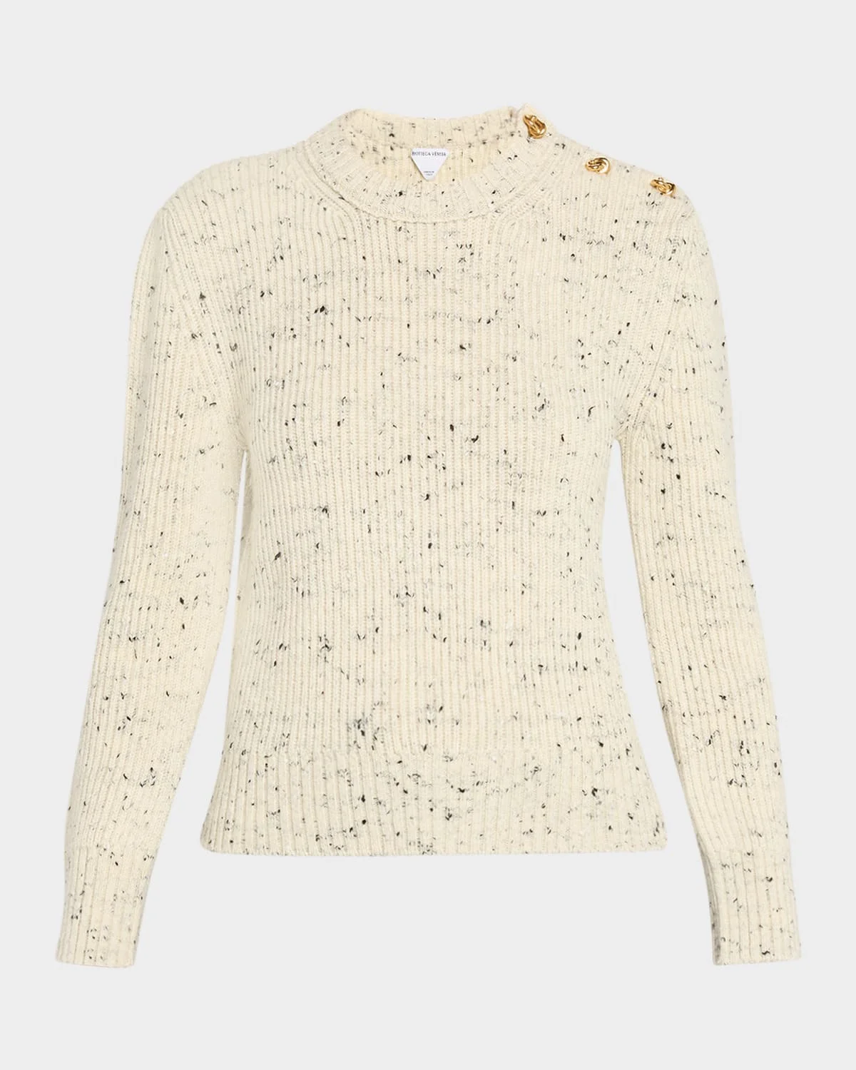 Button-Shoulder Speckled Rib Crewneck Sweater