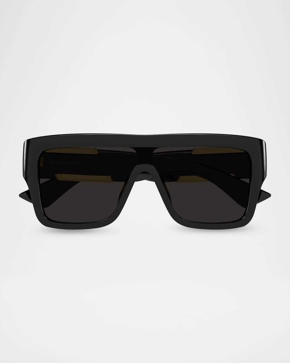 The "BV1451S-001" rectangular sunglasses by Bottega Veneta showcase goldtone ribbon on the arms Lens/bridge/temple (in mm): 99-1-145 Solid lenses Saddle nose bridge Wide, tapered arms Acetate 100% UVA/UVB protection Made in Japan