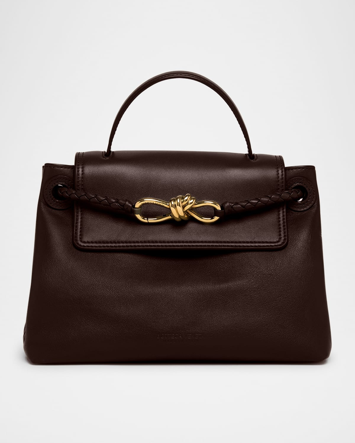 - Bottega Veneta "Ciao Ciao" small crossbody bag crafted in soft calfskin leather - Top handle, 3" drop - Sliding braided shoulder strap with metal push-lock gathering - Detachable, adjustable crossbody strap - Can be worn as a top handle, shoulder, or crossbody bag - Flap top with hook closure - Bonded suede lining - Divided interior with Intrecciato pocket and one zip pocket - Approx. 7.5"H x 10.2"W x 4.1"D - Made in Italy