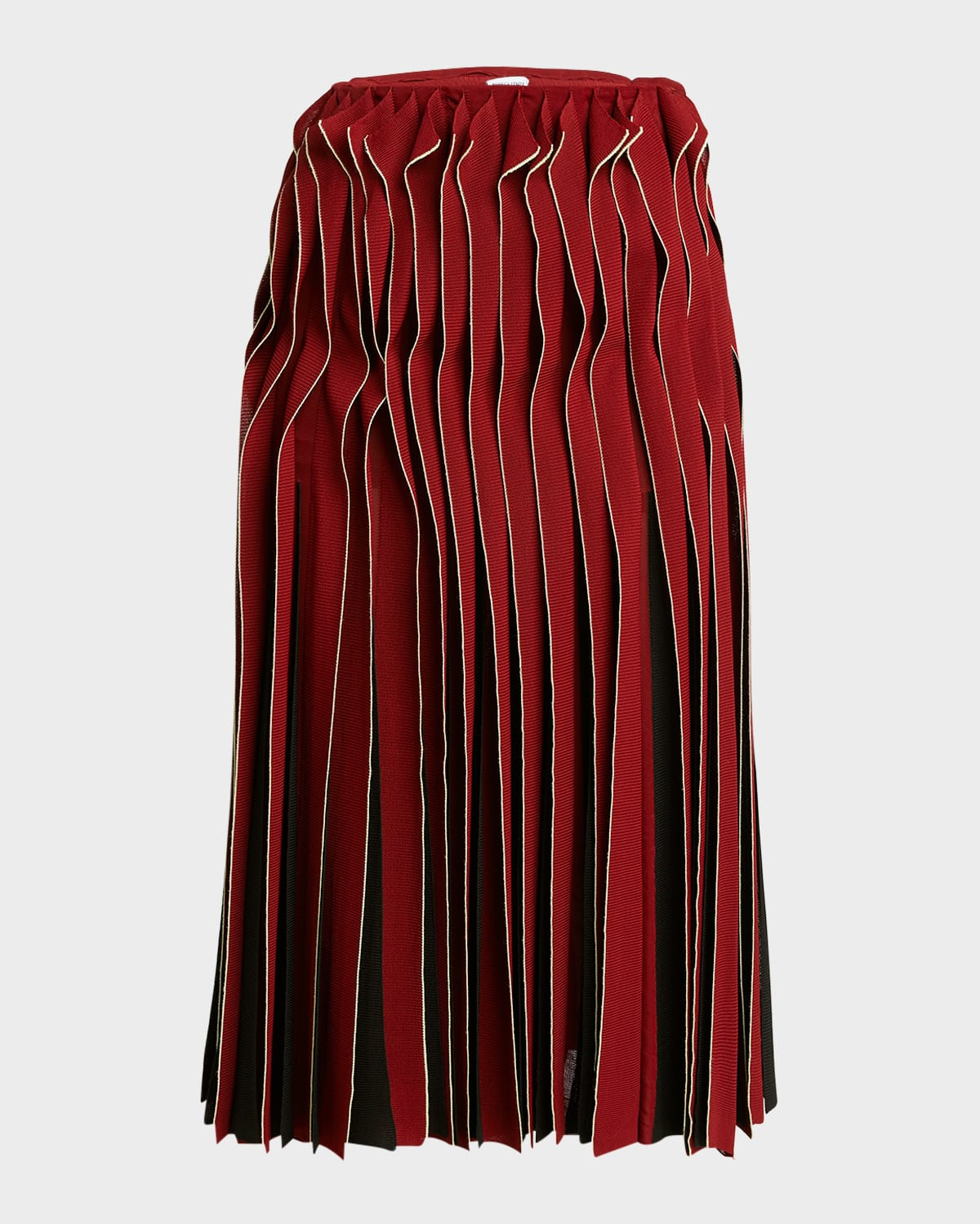 Bottega Veneta skirt rendered in a dimensional construction through the use of pleating, gathering, and piping Highrise waistband Hem falls below the knee Aline silhouette Slipon style Polyester/silk/nylon/polyamide Made in Italy