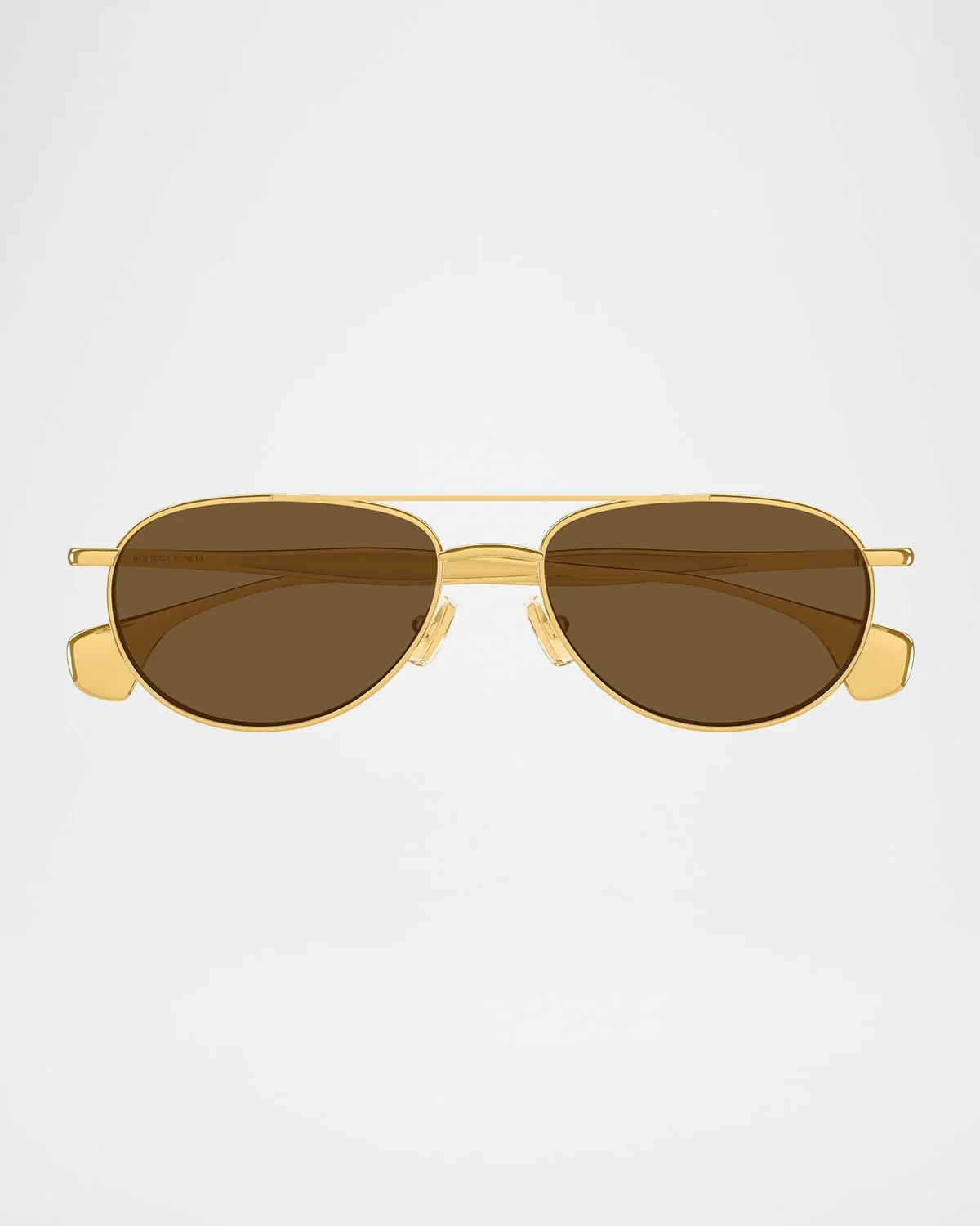 The "Fin" metal sunglasses by Bottega Veneta feature organicallyshaped temples with fininspired temple tips. Lens/bridge/temple (in mm): 5617140 Aviator frames with brow bar Saddle nose bridge Adjustable nose pads Thin, tapered arms with engraved logo script on temples 100% UVA/UVB protection Made in Japan