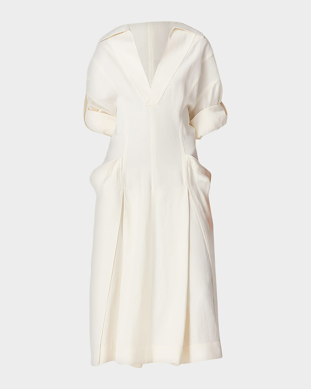 - Bottega Veneta dress in grainy viscose and linen with metal frog embellishments - Johnny collar - Long roll-up sleeves - Side patch pockets - Hem falls below the knee - Fit-and-flare silhouette - Godet hem - Slipover style - Viscose/linen - Made in Italy
