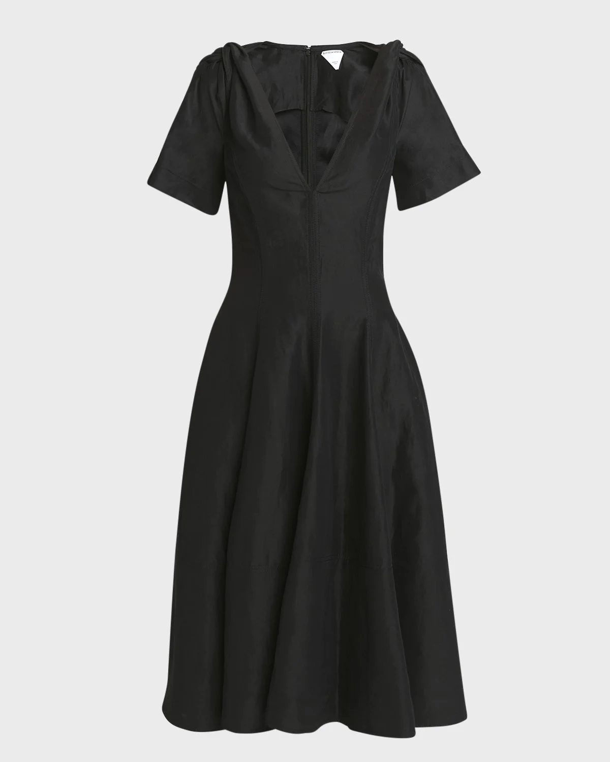 Bottega Veneta fluid viscose and linen midi dress features twist details at the shoulders Vneckline Short sleeves Hem falls below the knee Aline silhouette Concealed back zip Viscose/linen Made in Italy