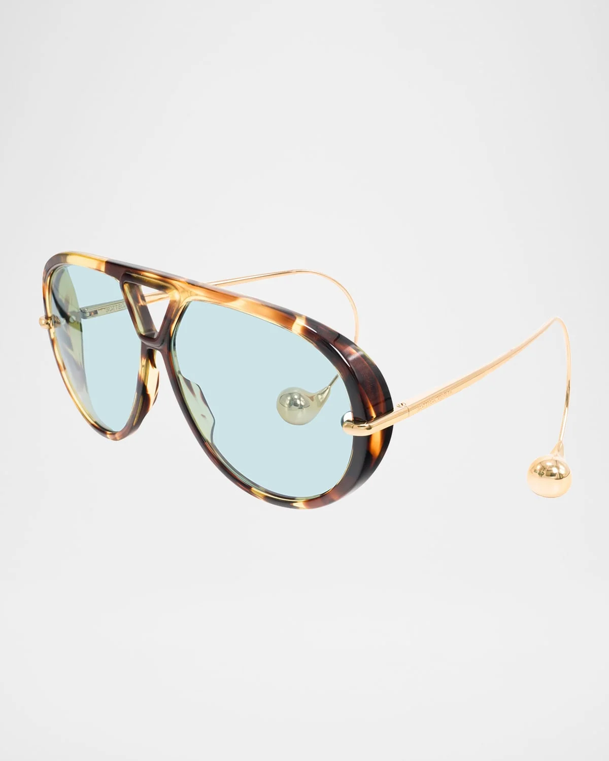 - Bottega Veneta "BV1273S" aviator sunglasses in acetate and metal alloy - Lens/bridge/temple (in mm): 63-12-180 - Double nose bridge - Solid lenses - Engraved logo on temples - Thin, tapered arms - Ball accent on earpieces - 100% UVA/UVB protection - Made in Japan - Proposition 65 warning for California residents - This product contains perfluoroalkyl and polyfluoroalkyl substances (PFAS). For more information, please visit the manufacturer’s website.