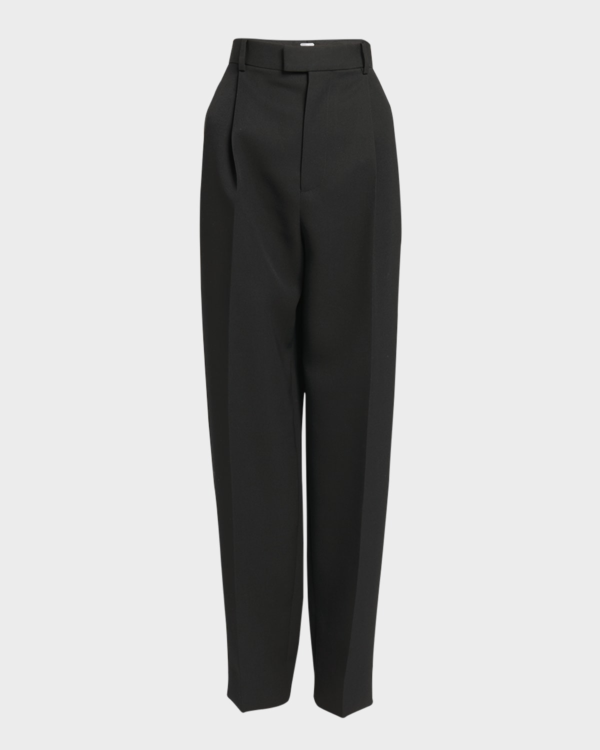 Bottega Veneta trousers featuring a pleated front and signature foldover back pocket detail High waist Side slip pockets; back welt pockets Straight legs Full length Hook tab/zip fly; belt loops Wool Made in Italy