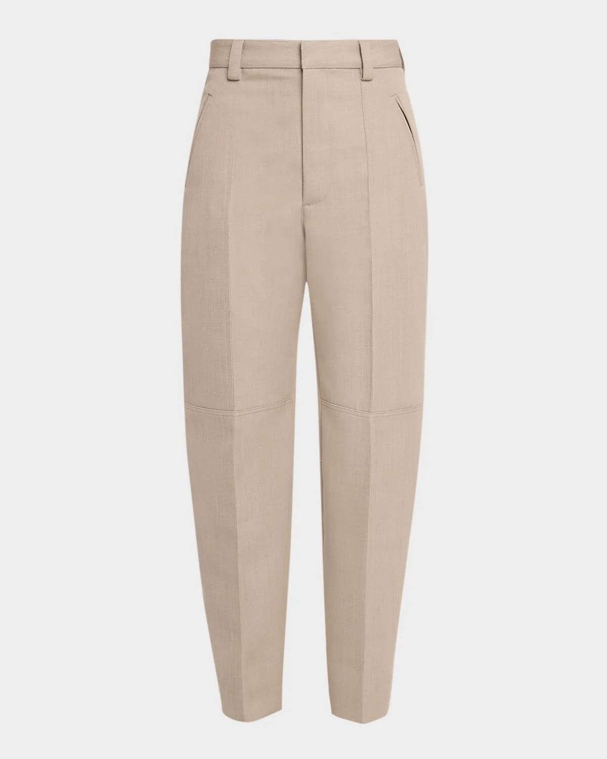 Bottega Veneta trousers feature paneling detail and zip hem details High rise Angled side doublewelt pockets Back double welt pockets with signature triangle detail Tapered legs Cropped at the ankle Buttontab/zip cuffs Hook/zip fly; belt loops Wool Made in Italy