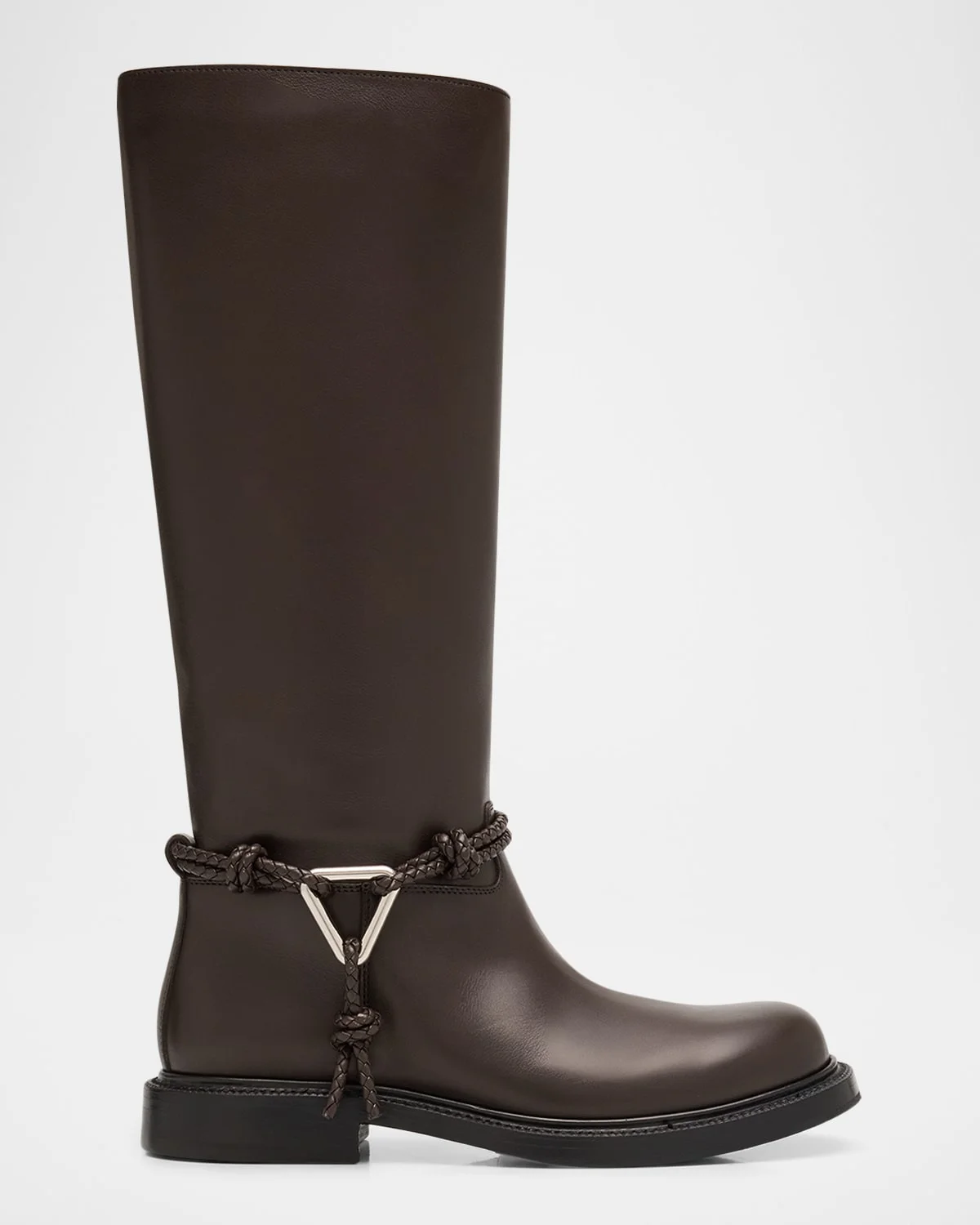 The James kneehigh riding boots by Bottega Veneta are crafted from smooth calf leather with coaxial detailing and a signature metal triangle Flat stacked heel Round toe Pullon style Leather lining Rubber outsole Made in Italy