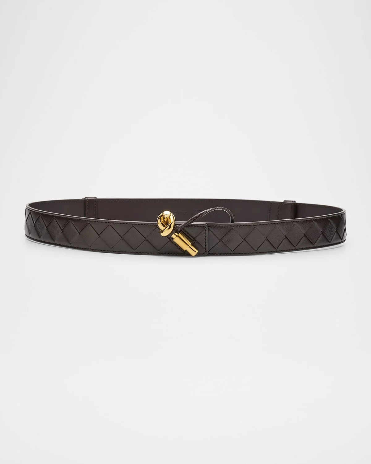 - Bottega Veneta calf leather belt featuring Intrecciato construction - Approx. 1.2"W - Knotted buckle detail - Cut to size - Leather/brass - Made in Italy