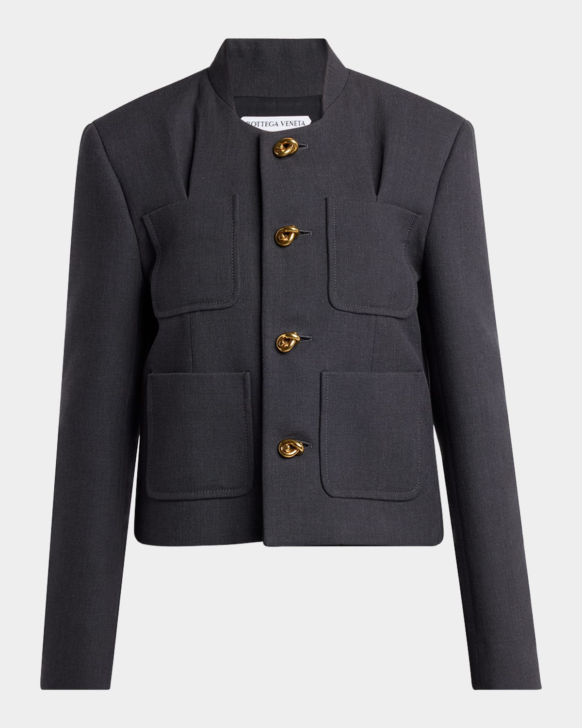 Bottega Veneta light structured cotton jacket featuring signature goldtone knot buttons and shoulder pleat details Band collar; singlebreasted front Long sleeves Padded shoulders Front patch pockets Straight fit Hip length Button closure Cotton/viscose/nylon/polyamide Made in Italy