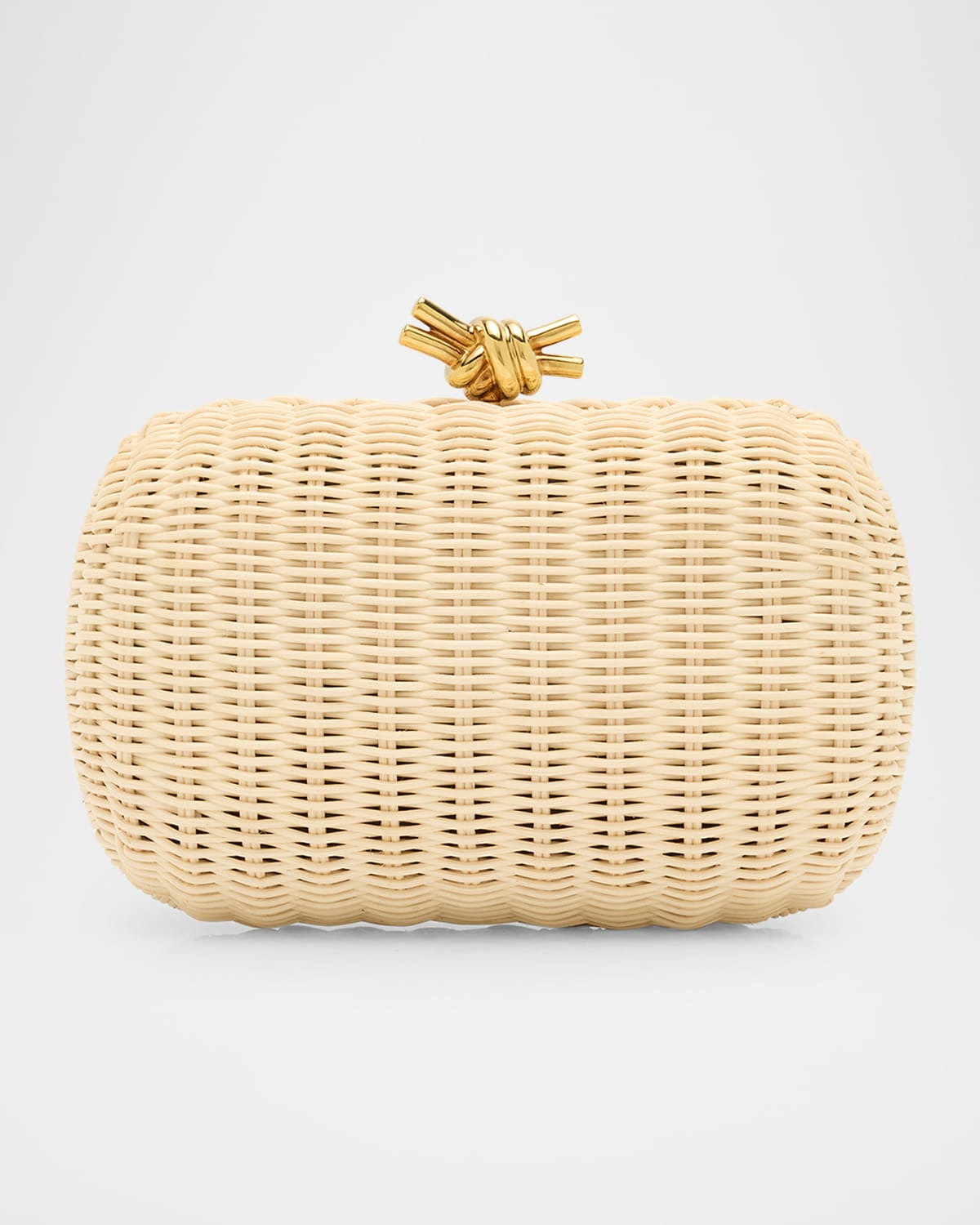 - Bottega Veneta clutch bag in rattan and leather - Woven chain/leather crossbody strap - Can be worn as a clutch or crossbody bag - Framed top with knot lift-clasp closure - Approx. 4.3"H x 7.5"W x 2"D - Made in Italy