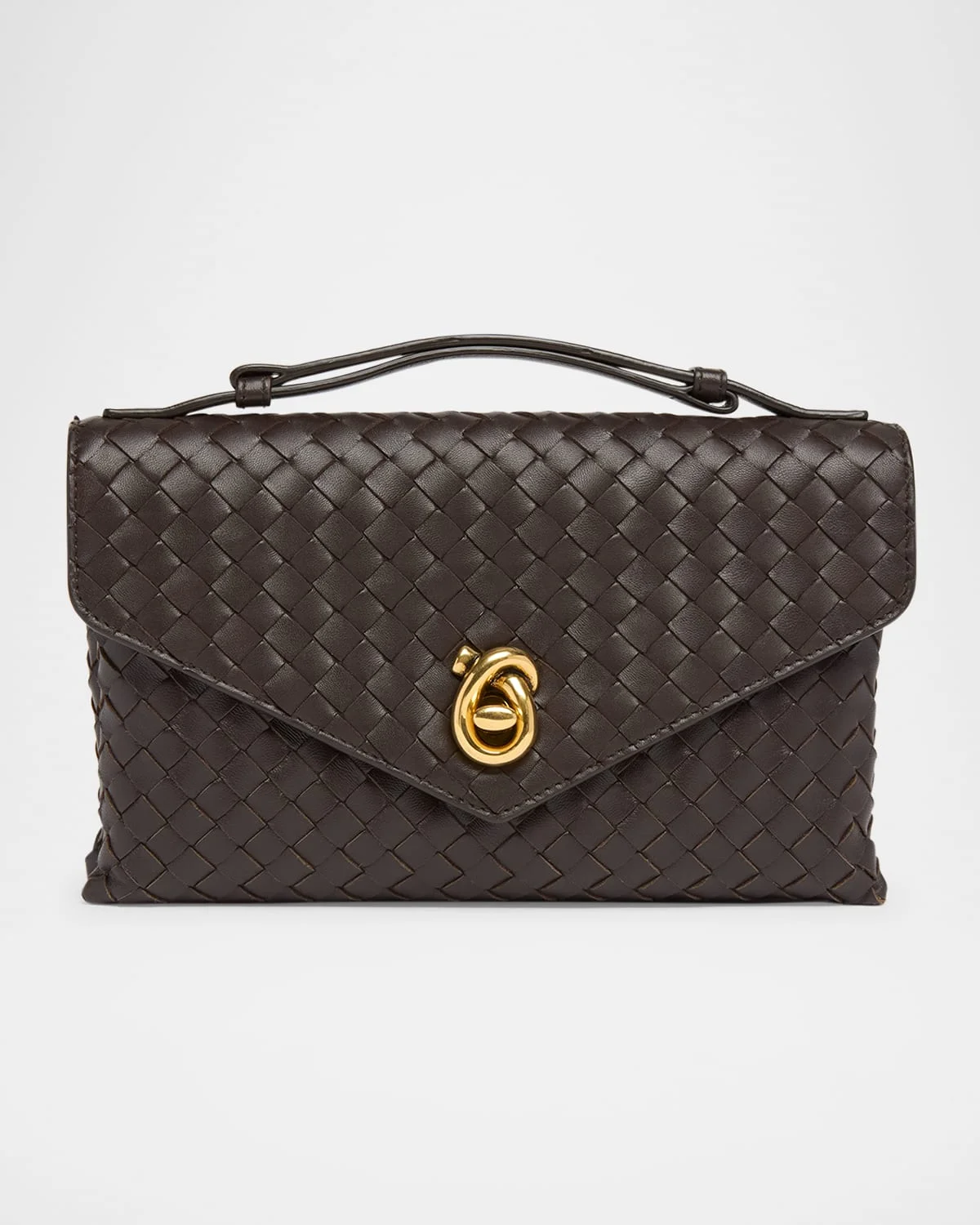 - Bottega Veneta "Knot Lock" convertible top handle bag in signature intrecciato leather - Adjustable top handle - Adjustable shoulder strap - Can be worn as a top handle or shoulder bag - Envelope flap top with turn-lock closure - Exterior, back slip pocket - Divided interior - Approx. 6.2"H x 9.8"W x 2.1"D - Made in Italy
