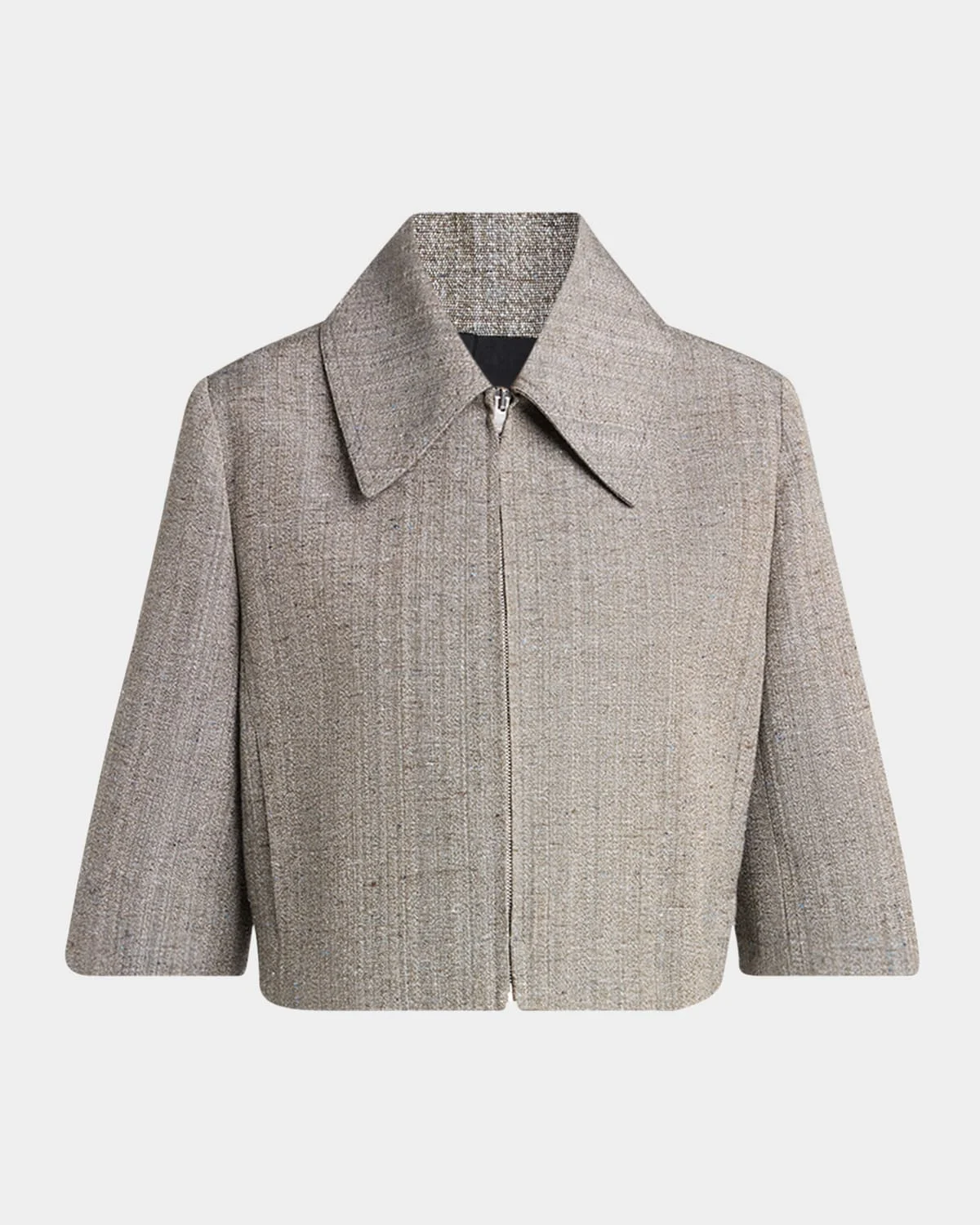 - A modern approach to suiting, this tailored Bottega Veneta jacket in knotted melange offers textural depth and refined structure. It pairs seamlessly with the coordinating midi skirt or suiting trousers for a look that transitions effortlessly - Spread collar; concealed zip front - 3/4 sleeves - On-seam pockets - Cropped hem - Boxy cut - Slim fit - Fully lined - Viscose/silk - Made in Italy