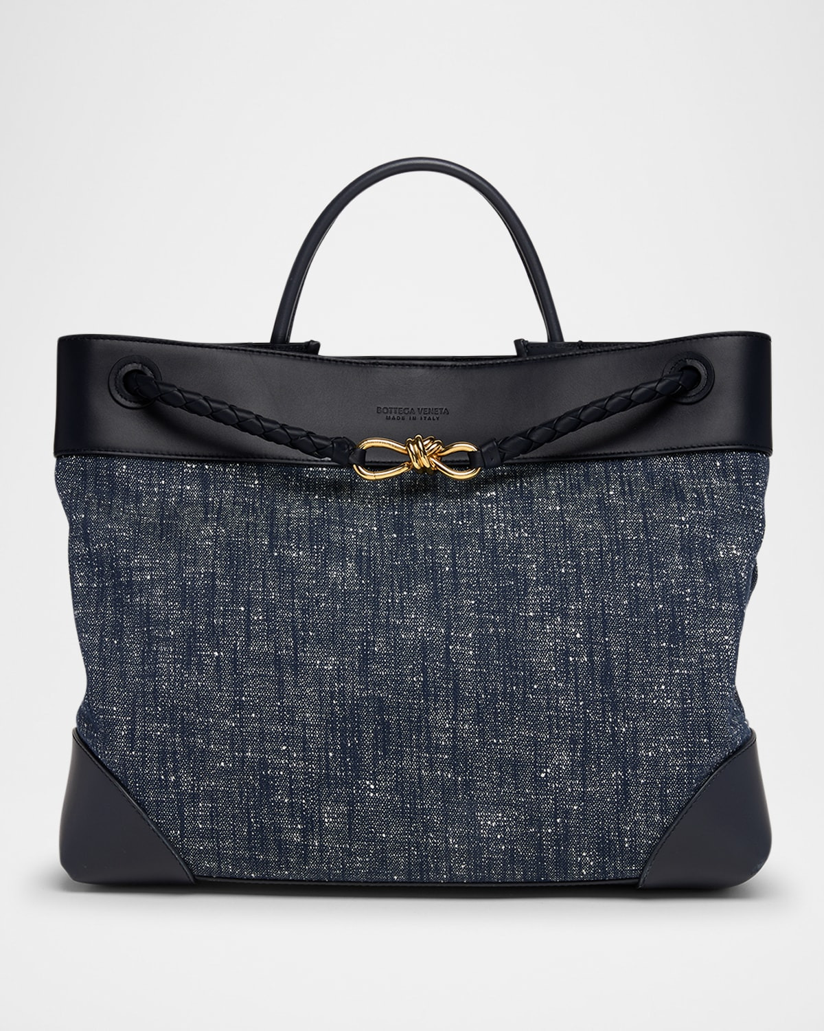 - Bottega Veneta "Andiamo" crossbody bag in denim boucle fabric and leather - Top handle - Adjustable braided crossbody strap with knot hardware - Can be worn as a top handle, shoulder, or crossbody bag - Open top with magnetic closure - Interior, one zip pocket, two slip pockets - Approx. 13.8"H x 16.5"W x 7.1"D - Made in Italy