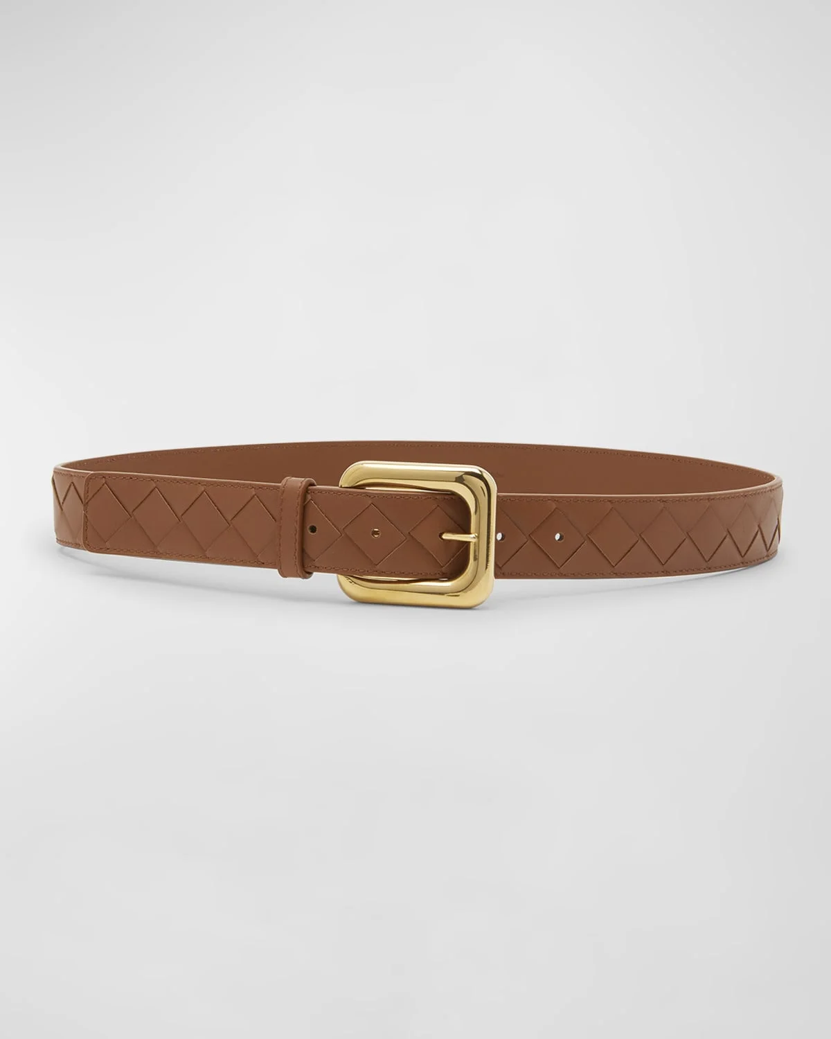 Bottega Veneta woven belt in dyed calf leather with brass hardware Beveled frame buckle Tonal stitching Adjustable fit Made in Italy