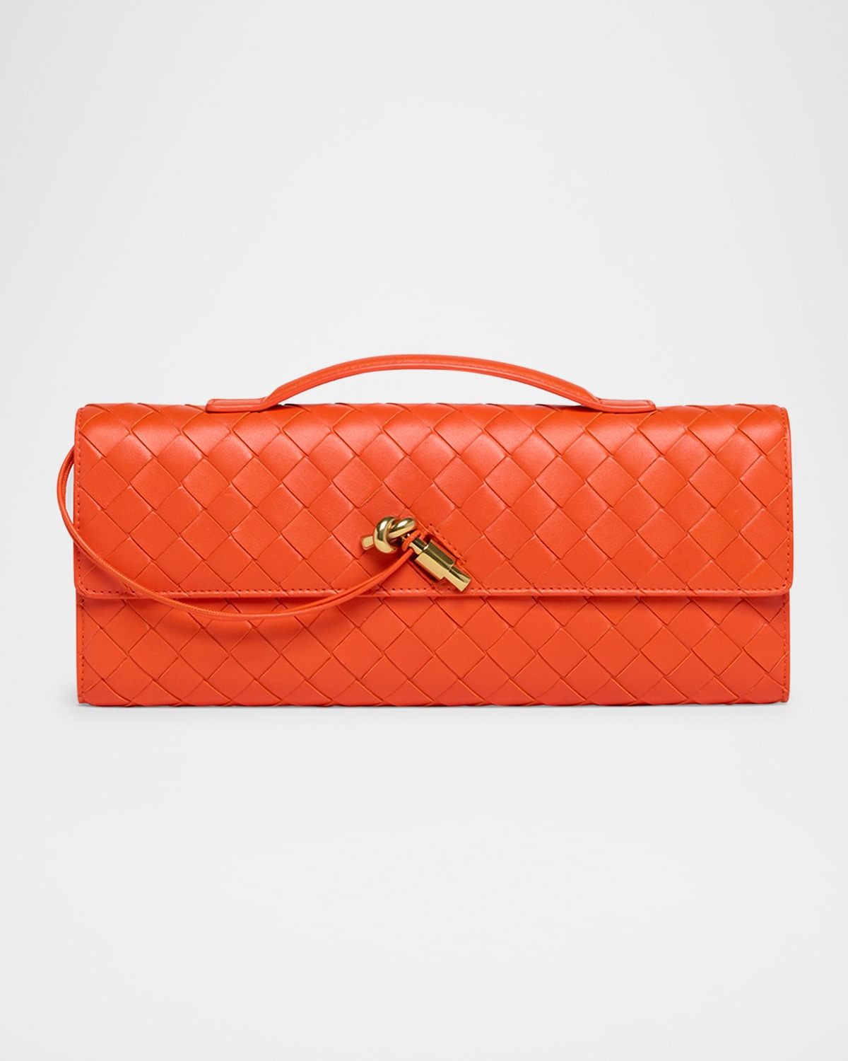 - Bottega Veneta "Andiamo" wallet in - intrecciato - leather - Top handle - Can be worn as a top handle or wallet - Flap top with knot lock - Approx. 5.1"H x 12.2"W x 1.2"D - Made in Italy