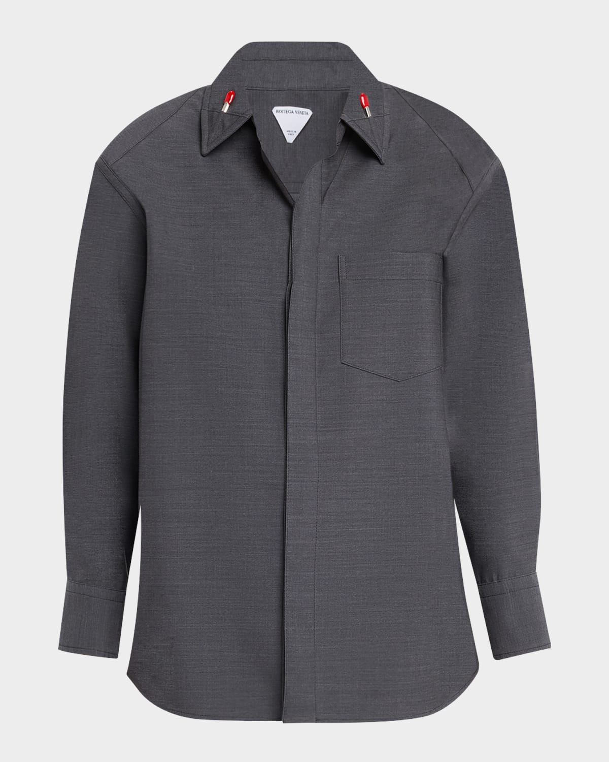 - Bottega Veneta light travel wool shirt embellished with goldtone matches on the collar - Spread collar; concealed button front - Long sleeves; button cuffs - Loose fit - Wool/cotton - Made in Italy - Proposition 65 warning for California residents