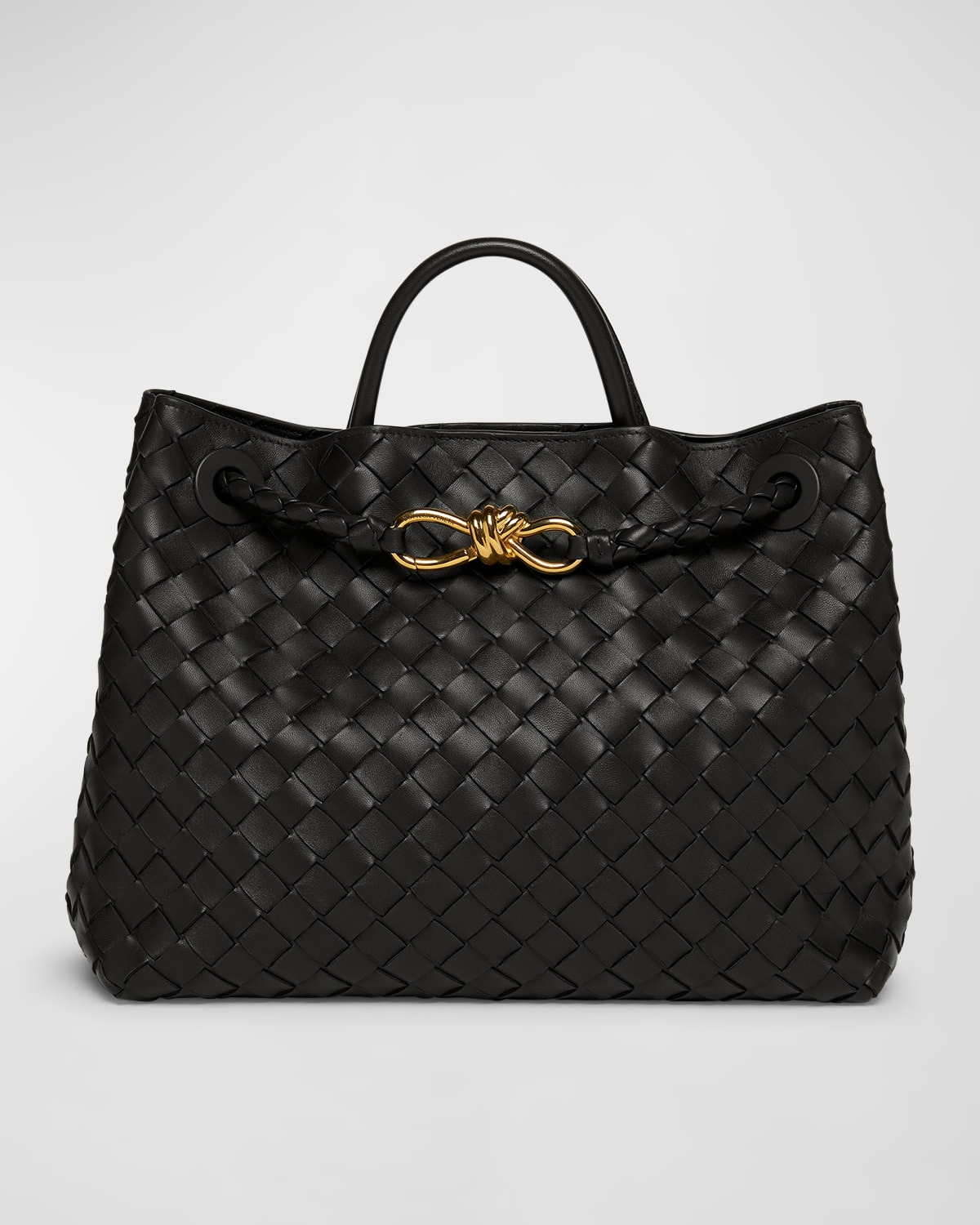 - Bottega Veneta "Andiamo" top handle bag in - intreccio - lambskin leather - Rolled top handle, 3.5" drop - Shoulder strap - Can be worn as a top handle or shoulder bag - Open top with magnetic closure; metal knot center strap - Approx. 9.8"H x 11.6"W x 4.3"D - Made in Italy