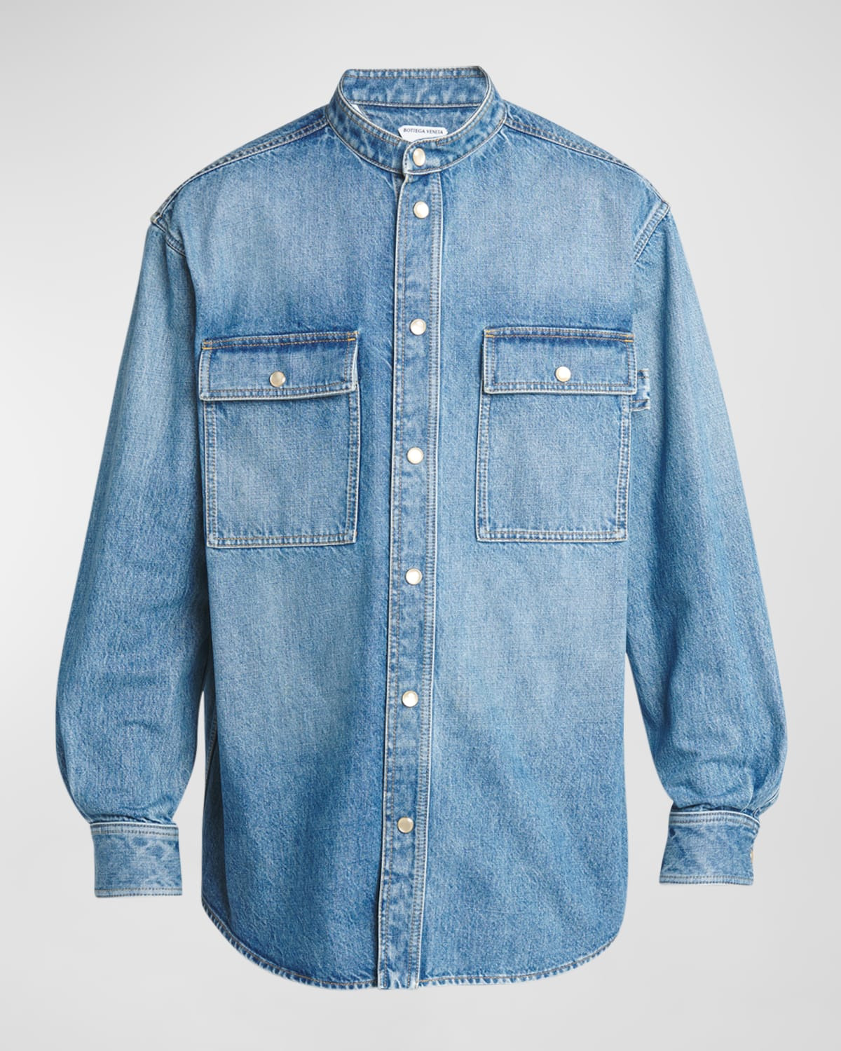 - Bottega Veneta shirt in eco-washed denim - Band collar - Snap front closure - Dual flap pockets at chest - Long sleeves - Squared barrel cuffs - Yoked back shoulders - Cotton - Made in Italy - Model is 6'1"/185cm.