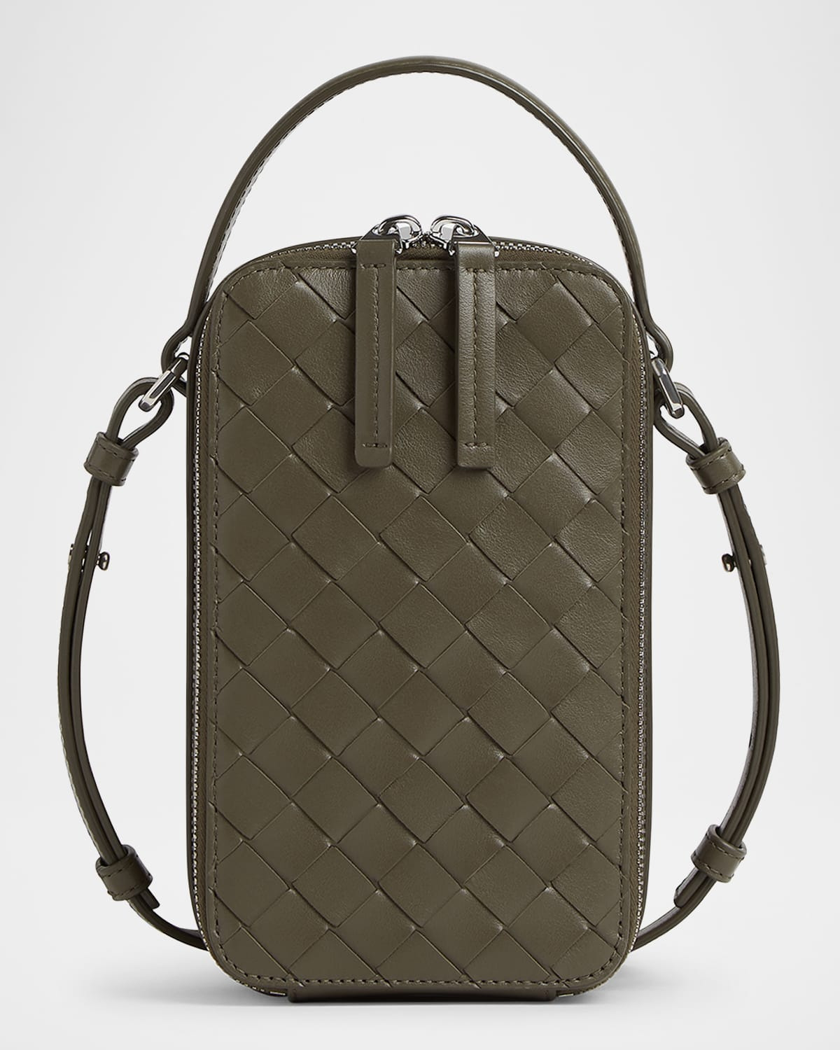 - Bottega Veneta "Getaway" phone pouch in calfskin leather featuring intrecciato craftsmanship - Top handle; 2.7" drop - Adjustable crossbody strap; 21.6" drop - Two-way zip closure - Interior, one main compartment, one flat pocket - Leather gussets keep items secure - Approx. 7.5”H x 4.3”W x 1.6”D - Made in Italy