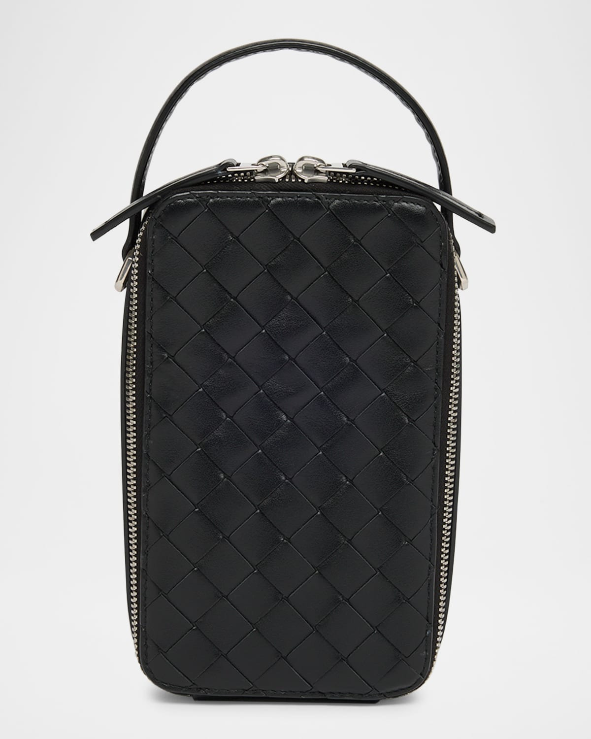 - Bottega Veneta "Getaway" phone pouch in calfskin leather featuring intrecciato craftsmanship - Top handle; 2.7" drop - Adjustable crossbody strap; 21.6" drop - Two-way zip closure - Interior, one main compartment, one flat pocket - Leather gussets keep items secure - Approx. 7.5”H x 4.3”W x 1.6”D - Made in Italy